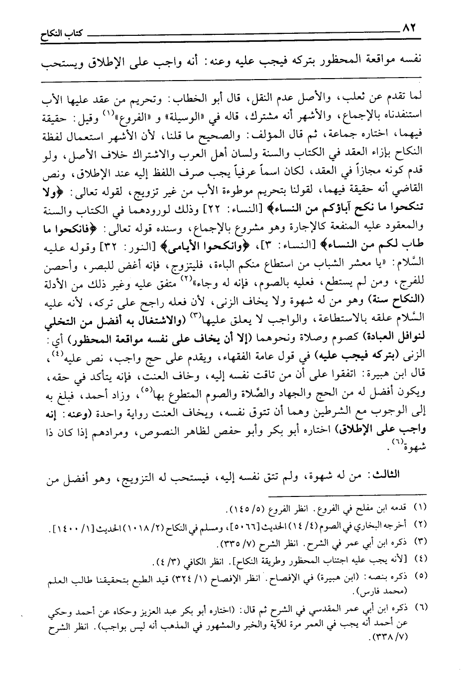 (النِّكَاحُ سُنَّةٌ) وَهُوَ مَنْ لَهُ شَهْوَةٌ وَلَا يَخَافُ الزِّنَا ; لِأَنَّ فِعْلَهُ رَاجِحٌ عَلَى تَرْكِهِ ; لِأَنَّهُ - عَلَيْهِ السَّلَامُ - عَلَّقَهُ بِالِاسْتِطَاعَةِ، وَالْوَاجِبُ لَا يُعَلَّقُ عَلَيْهَا (وَالِاشْتِغَالُ بِهِ أَفْضَلُ مِنَ التَّخَلِّي لِنَوَافِلِ الْعِبَادَةِ) كَصَوْمٍ وَصَلَاةٍ، وَنَحْوِهِمَا (إِلَّا أَنْ يَخَافَ عَلَى نَفْسِهِ مُوَاقَعَةَ الْمَحْظُورِ) أَيِ: الزِّنَا (بِتَرْكِهِ، فَيَجِبُ عَلَيْهِ) فِي قَوْلِ عَامَّةِ الْفُقَهَاءِ، وَيُقْدِمُ عَلَى حَجٍّ وَاجِبٍ، نَصَّ عَلَيْهِ، قَالَ ابْنُ هُبَيْرَةَ: اتَّفَقُوا عَلَى أَنَّ مَنْ تَاقَتْ نَفْسُهُ إِلَيْهِ، وَخَافَ الْعَنَتَ، فَإِنَّهُ يَتَأَكَّدُ فِي حَقِّهِ، وَيَكُونُ أَفْضَلَ لَهُ مِنَ الْحَجِّ، وَالْجِهَادِ وَالصَّلَاةِ وَالصَّوْمِ الْمُتَطَوِّعِ بِهَا، وَزَادَ أَحْمَدُ، فَبَلَغَ بِهِ إِلَى الْوُجُوبِ مَعَ الشَّرْطَيْنِ، وَهُمَا: أَنْ تَتُوقَ نَفْسُهُ، وَيَخَافَ الْعَنَتَ رِوَايَةٌ وَاحِدَةٌ (وَعَنْهُ: إِنَّهُ وَاجِبٌ عَلَى الْإِطْلَاقِ) اخْتَارَهُ أَبُو بَكْرٍ، وَأَبُو حَفْصٍ لِظَاهِرِ النُّصُوصِ، وَمُرَادُهُمْ إِذَا كَانَ ذَا شَهْوَةٍ.