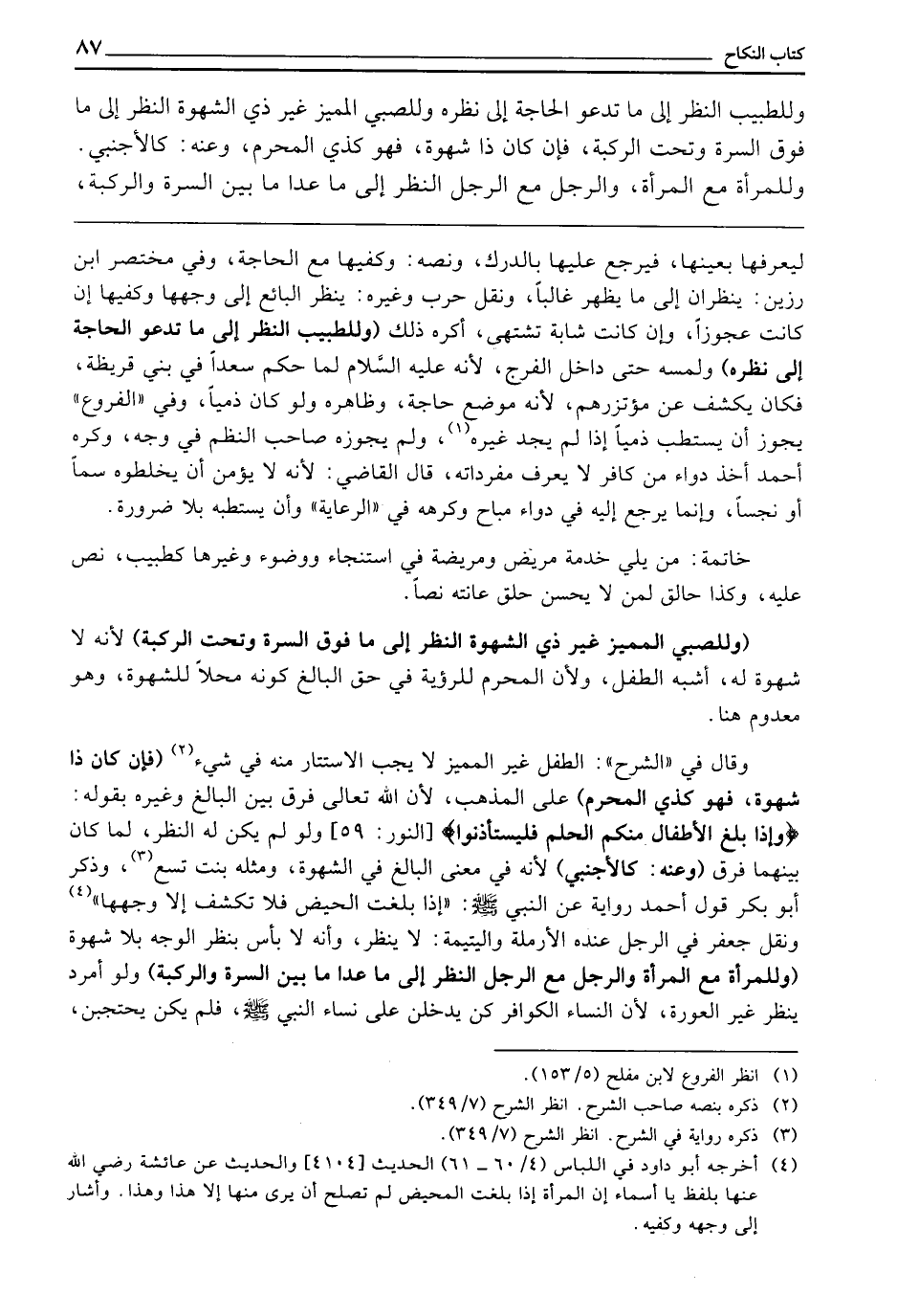 وَلِلطَّبِيبِ النَّظَرُ إِلَى مَا تَدْعُو الْحَاجَةُ إِلَى نَظَرِهِ، وَلِلصَّبِيِّ الْمُمَيَّزِ غَيْرِ ذِي الشَّهْوَةِ النَّظَرُ إِلَى مَا فَوْقَ السُّرَّةِ وَتَحْتَ الرُّكْبَةِ، فَإِنْ كَانَ ذَا شَهْوَةٍ، فَهُوَ كَذِي الْمَحْرَمِ، وَعَنْهُ: كَالْأَجْنَبِيِّ. وَلِلْمَرْأَةِ مَعَ الْمَرْأَةِ، وَالرَّجُلِ مَعَ الرَّجُلِ النَّظَرُ إِلَى مَا عَدَا مَا بَيْنَ السُّرَّةِ وَالرُّكْبَةِ،