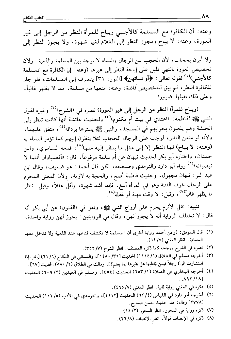 (وَيُبَاحُ لِلْمَرْأَةِ النَّظَرُ مِنَ الرَّجُلِ إِلَى غَيْرِ الْعَوْرَةِ) نَصَرَهُ فِي " الشَّرْحِ " وَغَيْرِهِ ; لِقَوْلِ النَّبِيِّ - صَلَّى اللَّهُ عَلَيْهِ وَسَلَّمَ - لِفَاطِمَةَ: «اعْتَدِّي فِي بَيْتِ أُمِّ مَكْتُومٍ» ; وَلِحَدِيثِ عَائِشَةَ «أَنَّهَا كَانَتْ تَنْظُرُ إِلَى الْحَبَشَةِ وَهُمْ يَلْعَبُونَ بِحِرَابِهِمْ فِي الْمَسْجِدِ، وَالنَّبِيُّ - صَلَّى اللَّهُ عَلَيْهِ وَسَلَّمَ - يَسْتُرُهَا بِرِدَائِهِ» مُتَّفَقٌ عَلَيْهِمَا ; وَلِأَنَّهُ لَوْ مُنِعْنَ النَّظَرَ، لَوَجَبَ عَلَى الرِّجَالِ الْحِجَابُ ; لِئَلَّا يَنْظُرْنَ إِلَيْهِمْ كَمَا تُؤْمَرُ النِّسَاءُ بِهِ (وَعَنْهُ: لَا يُبَاحُ) لَهَا النَّظَرُ إِلَّا إِلَى مِثْلِ مَا يَنْظُرُ إِلَيْهِ مِنْهَا، قَدَّمَهُ السَّامَرِّيُّ، وَابْنُ حَمْدَانَ، وَاخْتَارَهُ أَبُو بَكْرٍ ; لِحَدِيثِ نَبْهَانَ، عَنْ أُمِّ سَلَمَةَ مَرْفُوعًا، قَالَ: «أَفَعَمْيَاوَانِ أَنْتُمَا لَا تُبْصِرَانِهِ» رَوَاهُ أَبُو دَاوُدَ، وَالتِّرْمِذِيُّ، وَصَحَّحَهُ، لَكِنْ قَالَ أَحْمَدُ: هُوَ ضَعِيفٌ، وَقَالَ ابْنُ عَبْدِ الْبَرِّ: نَبْهَانُ مَجْهُولٌ، وَحَدِيثُ فَاطِمَةَ أَصَحُّ، وَالْحُجَّةُ بِهِ لَازِمَةٌ ; وَلِأَنَّ الْمَعْنَى الْمُحَرَّمَ عَلَى الرِّجَالِ خَوْفُ الْفِتْنَةِ، وَهُوَ فِي الْمَرْأَةِ أَبْلَغُ ; فَإِنَّهَا أَشَدُّ شَهْوَةً، وَأَقَلُّ عَقْلًا، وَقِيلَ: تَنْظُرُ مَا يَظْهَرُ غَالِبًا، وَقِيلَ: لَا وَقْتَ مِهْنَةٍ أَوْ غَفْلَةٍ.