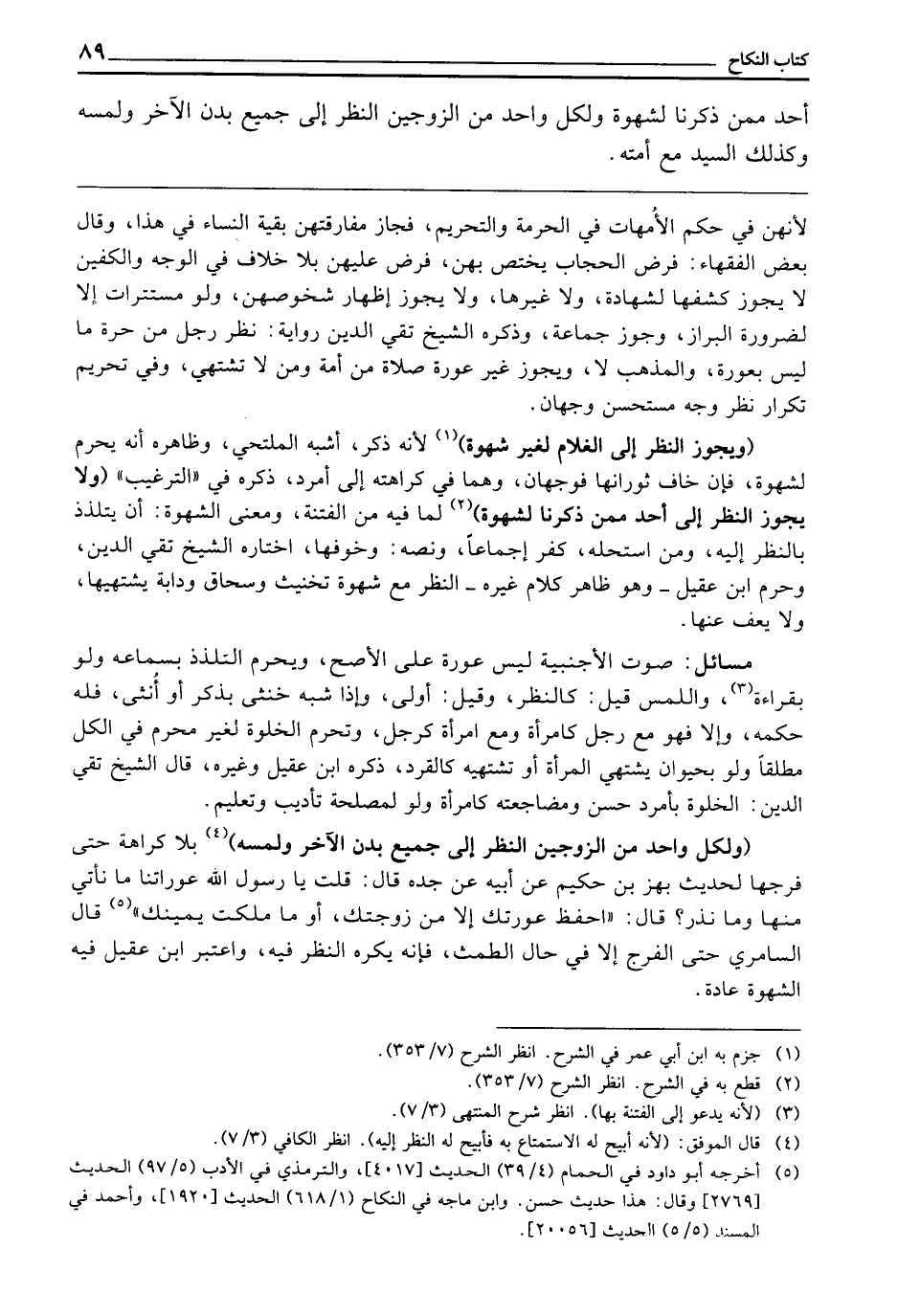 (وَلِكُلِّ وَاحِدٍ مِنَ الزَّوْجَيْنِ النَّظَرُ إِلَى جَمِيعِ بَدَنِ الْآخَرِ وَلَمْسِهِ) بِلَا كَرَاهَةٍ حَتَّى فَرْجِهَا ; لِحَدِيثِ بَهْزِ بْنِ حَكِيمٍ، عَنْ أَبِيهِ، عَنْ جَدِّهِ، قَالَ: قُلْتُ: «يَا رَسُولَ اللَّهِ، عَوْرَاتُنَا مَا نَأْتِي مِنْهَا وَمَا نَذَرُ؛ قَالَ: احْفَظْ عَوْرَتَكَ إِلَّا مِنْ زَوْجَتِكَ أَوْ مَا مَلَكَتْ يَمِينُكَ» قَالَ السَّامَرِّيُّ: حَتَّى الْفَرْجَ، إِلَّا فِي حَالِ الطَّمْثِ، فَإِنَّهُ يُكْرَهُ النَّظَرُ فِيهِ، وَاعْتَبَرَ ابْنُ عَقِيلٍ فِيهِ الشَّهْوَةَ عَادَةً.