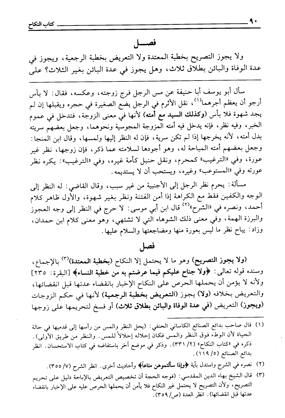 فَصْلٌ وَلَا يَجُوزُ التَّصْرِيحُ بِخِطْبَةِ الْمُعْتَدَّةِ، وَلَا التَّعْرِيضُ بِخِطْبَةِ الرَّجْعِيَّةِ، وَيَجُوزُ فِي عِدَّةِ الْوَفَاةِ وَالْبَائِنِ بِطَلَاقِ ثَلَاثٍ، وَهَلْ يَجُوزُ فِي عِدَّةِ الْبَائِنِ بِغَيْرِ الثَّلَاثِ؟ عَلَى
