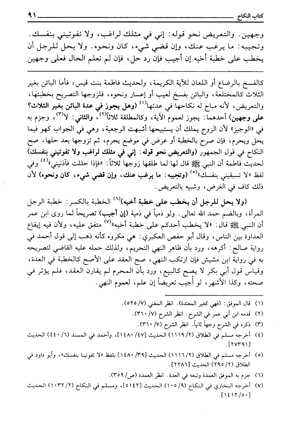 (وَلَا يَحِلُّ لِلرَّجُلِ أَنْ يَخْطُبَ عَلَى خِطْبَةِ أَخِيهِ) الْخِطْبَةُ بِالْكَسْرِ: خِطْبَةُ الرَّجُلِ الْمَرْأَةَ، وَبِالضَّمِّ: حَمْدُ اللَّهِ تَعَالَى، وَلَوْ ذِمِّيًّا فِي ذِمِّيَّةٍ (إِنْ أُجِيبَ) تَصْرِيحًا لِمَا رَوَى ابْنُ عُمَرَ أَنَّ النَّبِيَّ - صَلَّى اللَّهُ عَلَيْهِ وَسَلَّمَ - قَالَ: «لَا يَخْطُبُ أَحَدُكُمْ عَلَى خِطْبَةِ أَخِيهِ» مُتَّفَقٌ عَلَيْهِ ; وَلِأَنَّ فِيهِ إِيقَاعَ الْعَدَاوَةِ بَيْنَ النَّاسِ، وَقَالَ أَبُو حَفْصٍ الْعُكْبَرِيُّ: هِيَ مَكْرُوهٌ، كَأَنَّهُ ذَهَبَ إِلَى قَوْلِ أَحْمَدَ فِي رِوَايَةِ صَالِحٍ: أَكْرَهُهُ، وَرُدَّ بِأَنَّ ظَاهِرَ النَّهْيِ التَّحْرِيمُ ; وَلِذَلِكَ حَمَلَهُ عَلَيْهِ الْقَاضِي ; لِتَصْرِيحِهِ بِهِ فِي رِوَايَةِ ابْنِ مُشَيْشٍ، فَإِنِ ارْتَكَبَ النَّهْيَ صَحَّ الْعَقْدُ عَلَى الْأَصَحِّ، كَالْخِطْبَةِ فِي الْعِدَّةِ، وَقِيَاسُ قَوْلِ أَبِي بَكْرٍ لَا يَصِحُّ كَالْبَيْعِ، وَرُدَّ بِأَنَّ الْمُحَرَّمَ لَمْ يُقَارِنِ الْعَقْدَ، فَلَمْ يُؤَثِّرْ فِي صِحَّتِهِ، وَكَذَا الْأَشْهَرُ لَوْ أُجِيبَ تَعْرِيضًا، إِنْ عَلِمَ ; لِعُمُومِ النَّهْيِ.