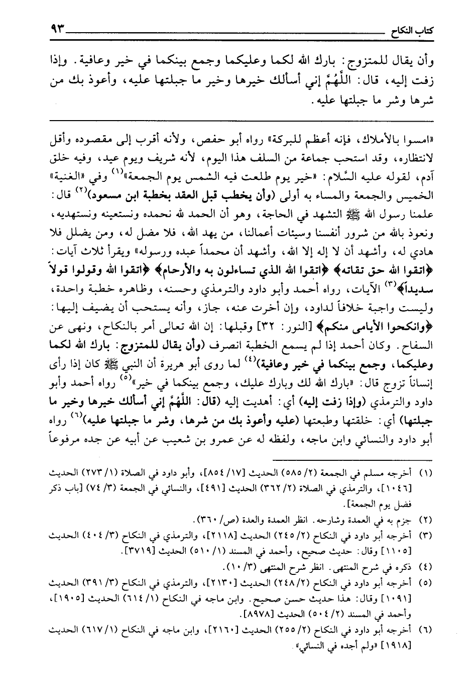 ـــــــــــــــــــــــــــــQ «امْسُوا بِالْأَمْلَاكِ ; فَإِنَّهُ أَعْظَمُ لِلْبَرَكَةِ» رَوَاهُ أَبُو حَفْصٍ ; وَلِأَنَّهُ أَقْرَبُ إِلَى مَقْصُودِهِ، وَأَقَلُّ لِانْتِظَارِهِ، وَقَدِ اسْتَحَبَّ جَمَاعَةٌ مِنَ السَّلَفِ هَذَا الْيَوْمَ ; لِأَنَّهُ شَرِيفٌ وَيَوْمُ عِيدٍ، وَفِيهِ خُلِقَ آدَمُ ; لِقَوْلِهِ - عَلَيْهِ السَّلَامُ -: «خَيْرُ يَوْمٍ طَلَعَتْ فِيهِ الشَّمْسُ يَوْمُ الْجُمُعَةِ» وَفِي " الْغُنْيَةِ ": الْخَمِيسُ وَالْجُمُعَةُ وَالْمَسَاءُ بِهِ أَوْلَى، (وَأَنْ يُخْطَبَ قَبْلَ الْعَقْدِ بِخُطْبَةِ ابْنِ مَسْعُودٍ) قَالَ: «عَلَّمَنَا رَسُولُ اللَّهِ - صَلَّى اللَّهُ عَلَيْهِ وَسَلَّمَ - التَّشَهُّدَ فِي الْحَاجَةِ، وَهُوَ أَنَّ الْحَمْدَ لِلَّهِ، نَحْمَدُهُ، وَنَسْتَعِينُهُ وَنَسْتَهْدِيهِ، وَنَعُوذُ بِاللَّهِ مِنْ شُرُورِ أَنْفُسِنَا وَسَيِّئَاتِ أَعْمَالِنَا، مَنْ يَهْدِ اللَّهُ فَلَا مُضِلَّ لَهُ، وَمَنْ يُضْلِلْ فَلَا هَادِيَ لَهُ، وَأَشْهَدُ أَنْ لَا إِلَهَ إِلَّا اللَّهُ، وَأَشْهَدُ أَنَّ مُحَمَّدًا عَبْدُهُ وَرَسُولُهُ وَيَقْرَأُ ثَلَاثَ آيَاتٍ {اتَّقُوا اللَّهَ حَقَّ تُقَاتِهِ} [آل عمران: 102] {وَاتَّقُوا اللَّهَ الَّذِي تَسَاءَلُونَ بِهِ وَالأَرْحَامَ} [النساء: 1] {اتَّقُوا اللَّهَ وَقُولُوا قَوْلا سَدِيدًا} [الأحزاب: 70] » الْآيَاتِ، رَوَاهُ أَحْمَدُ، وَأَبُو دَاوُدَ، وَالتِّرْمِذِيُّ وَحَسَّنَهُ، وَظَاهِرُهُ خُطْبَةٌ وَاحِدَةٌ، وَلَيْسَتْ وَاجِبَةً، خِلَافًا لِدَاوُدَ، وَإِنْ أُخِّرَتْ عَنْهُ جَازَ، وَإِنَّهُ يُسْتَحَبُّ أَنْ يُضِيفَ إِلَيْهَا {وَأَنْكِحُوا الأَيَامَى مِنْكُمْ} [النور: 32] الْآيَةَ وَقَبْلَهَا: إِنَّ اللَّهَ تَعَالَى أَمَرَ بِالنِّكَاحِ، وَنَهَى عَنِ السِّفَاحِ، وَكَانَ أَحْمَدُ إِذَا لَمْ يَسْمَعِ الْخُطْبَةَ انْصَرَفَ (وَأَنْ يُقَالَ لِلْمُتَزَوِّجِ: بَارَكَ اللَّهُ لَكُمَا وَعَلَيْكُمَا، وَجَمَعَ بَيْنَكُمَا فِي خَيْرٍ وَعَافِيَةٍ) ; لِمَا رَوَى أَبُو هُرَيْرَةَ «أَنَّ النَّبِيَّ - صَلَّى اللَّهُ عَلَيْهِ وَسَلَّمَ - كَانَ إِذَا رأى إِنْسَانًا تَزَوَّجَ قَالَ: بَارَكَ اللَّهُ لَكَ وَبَارَكَ عَلَيْكَ، وَجَمَعَ بَيْنَكُمَا فِي خَيْرٍ» رَوَاهُ أَحْمَدُ، وَأَبُو دَاوُدَ، وَالتِّرْمِذِيُّ، (وَإِذَا زُفَّتِ إِلَيْهِ) أَيْ: أُهْدِيَتْ إِلَيْهِ (قَالَ: اللَّهُمَّ إِنِّي أَسْأَلُكَ خَيْرَهَا، وَخَيْرَ مَا جَبَلْتَهَا) أَيْ: خَلَقْتَهَا وَطَبَعْتَهَا ( «عَلَيْهِ، وَأَعُوذُ بِكَ مِنْ شَرِّهَا، وَشَرِّ مَا جَبَلْتَهَا عَلَيْهِ» رَوَاهُ أَبُو دَاوُدَ، وَالنَّسَائِيُّ، وَابْنُ مَاجَهْ - وَلَفْظُهُ لَهُ - عَنْ عَمْرِو بْنِ شُعَيْبٍ، عَنْ أَبِيهِ، عَنْ جَدِّهِ، مَرْفُوعًا،