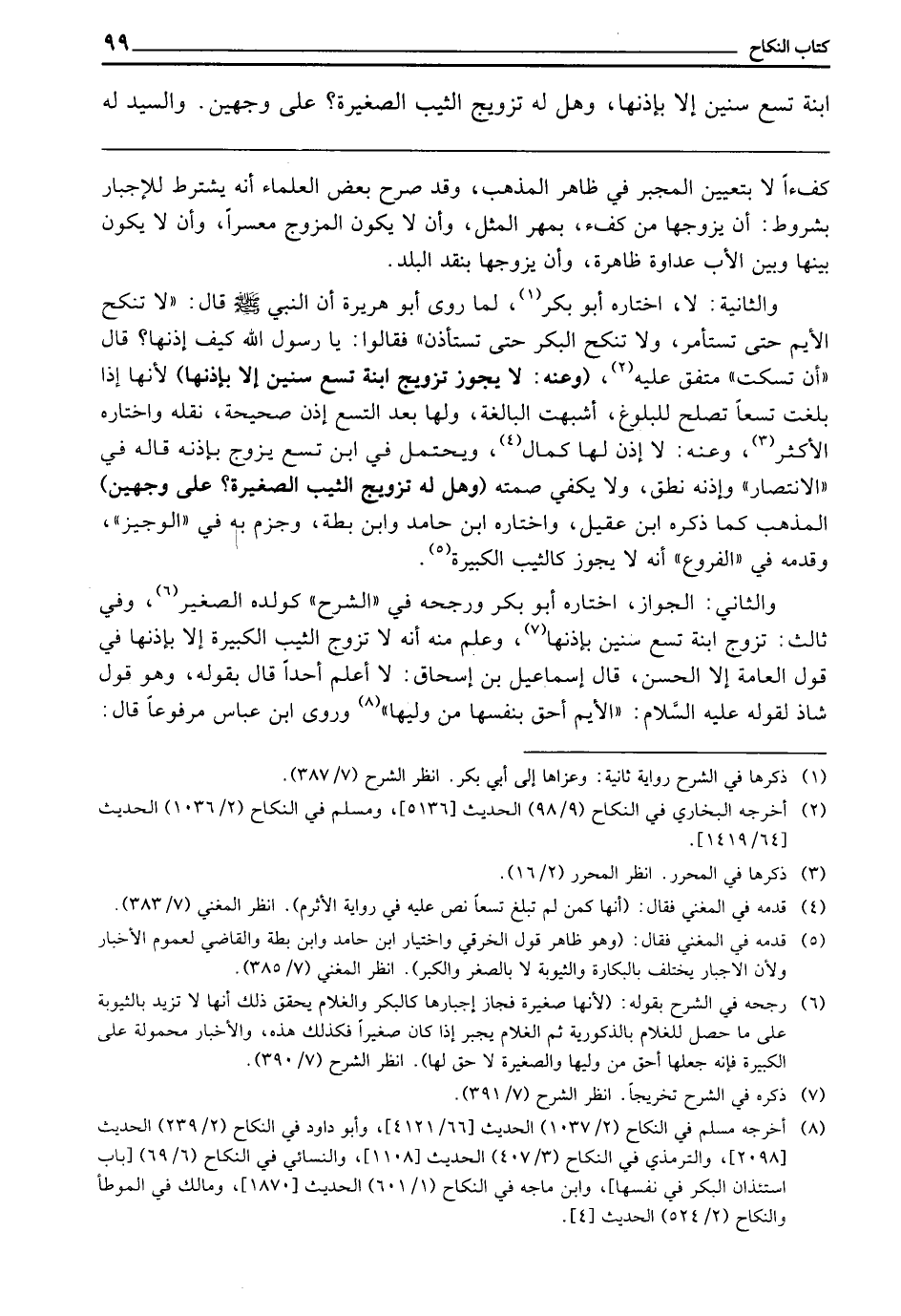 ابْنَةِ تِسْعِ سِنِينَ إِلَّا بِإِذْنِهَا، وَهَلْ لَهُ تَزْوِيجُ الثَّيِّبِ الصَّغِيرَةِ؟ عَلَى وَجْهَيْنِ. وَالسَّيِّدُ لَهُ