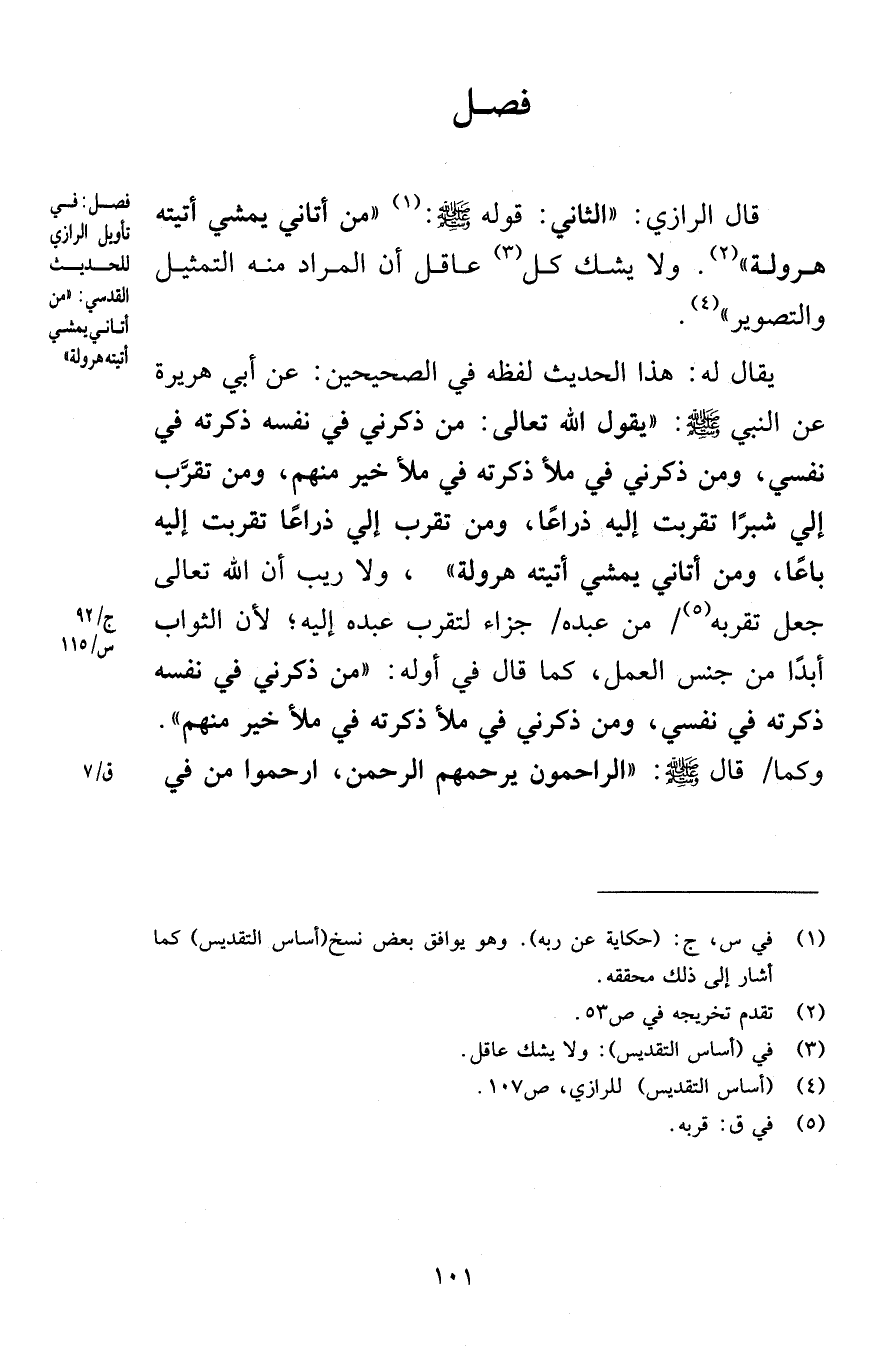 فصل قال الرازي الثاني قوله صلى الله عليه وسلم من أتاني يمشي أتيته هرولة ولا يشك كل عاقل أن المراد منه التمثيل والتصوير يقال له هذا الحديث لفظه في الصحيحين عن أبي هريرة عن النبي صلى الله عليه وسلم يقول الله تعالى من ذكرني في نفسه ذكرته في نفسي ومن ذكرني في ملأ ذكرته في ملأ خير منهم ومن تقرَّب إلي شبرًا تقربت إليه ذراعًا ومن تقرب إلي ذراعًا تقربت إليه باعًا ومن أتاني يمشي أتيته هرولة ولا ريب أن الله تعالى جعل تقربه من عبده جزاء لتقرب عبده إليه لأن الثواب أبدًا من جنس العمل كما قال في أوله من ذكرني في نفسه ذكرته في نفسي ومن ذكرني في ملأ ذكرته في ملأ خير منهم وكما قال صلى الله عليه وسلم الراحمون يرحمهم الرحمن وارحموا من في