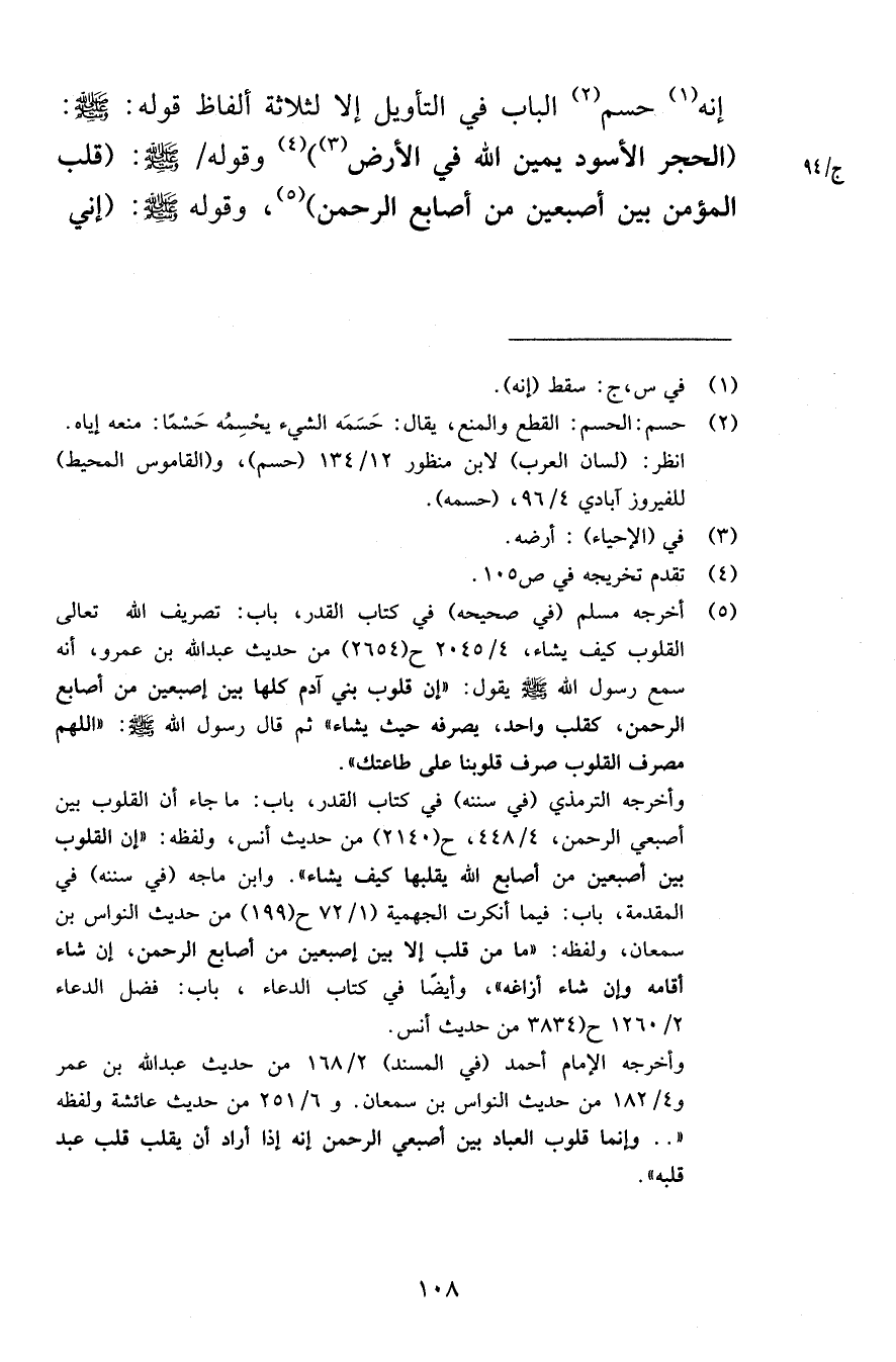 إنه حسم الباب في التأويل إلا لثلاثة ألفاظ قوله صلى الله عليه وسلم الحجر الأسود يمين الله في الأرض وقوله صلى الله عليه وسلم قلب المؤمن بين أصبعين من أصابع الرحمن وقوله صلى الله عليه وسلم إني