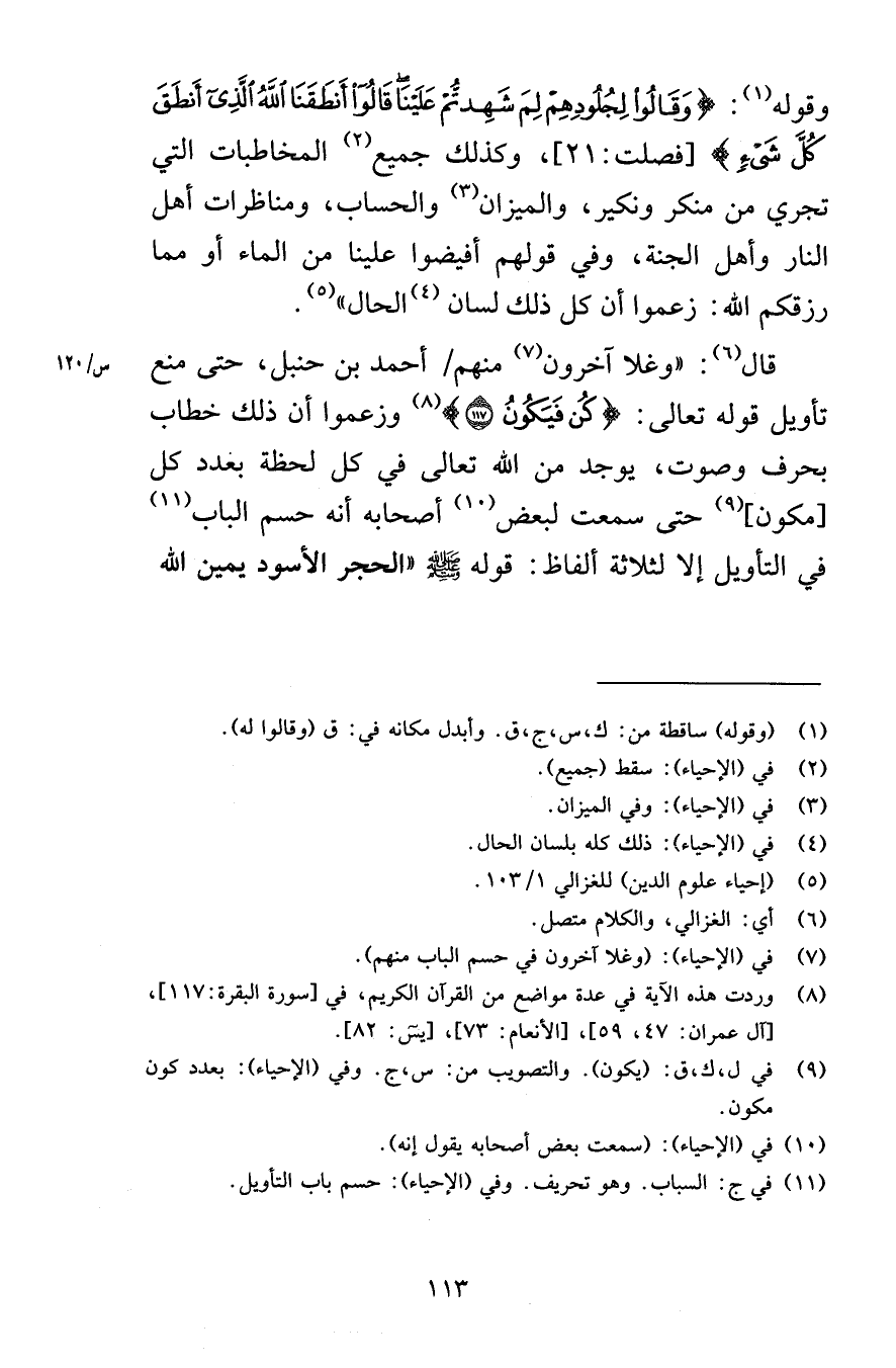 وقوله وَقَالُوا لِجُلُودِهِمْ لِمَ شَهِدْتُمْ عَلَيْنَا قَالُوا أَنْطَقَنَا اللَّهُ الَّذِي أَنْطَقَ كُلَّ شَيْءٍ [فصلت 21] وكذلك جميع المخاطبات التي تجري من منكر ونكير والميزان والحساب ومناظرات أهل النار وأهل الجنة وفي قولهم أفيضوا علينا من الماء أو مما رزقكم الله زعموا أن كل ذلك لسان الحال قال وغلا آخرون منهم أحمد بن حنبل حتى منع تأويل قوله تعالى كُنْ فَيَكُونُ (117) وزعموا أن ذلك خطاب بحرف وصوت يوجد من الله تعالى في كل لحظة بعدد كل مكون حتى سمعت لبعض أصحابه أنه حسم الباب في التأويل إلا لثلاثة ألفاظ قوله صلى الله عليه وسلم الحجر الأسود يمين الله