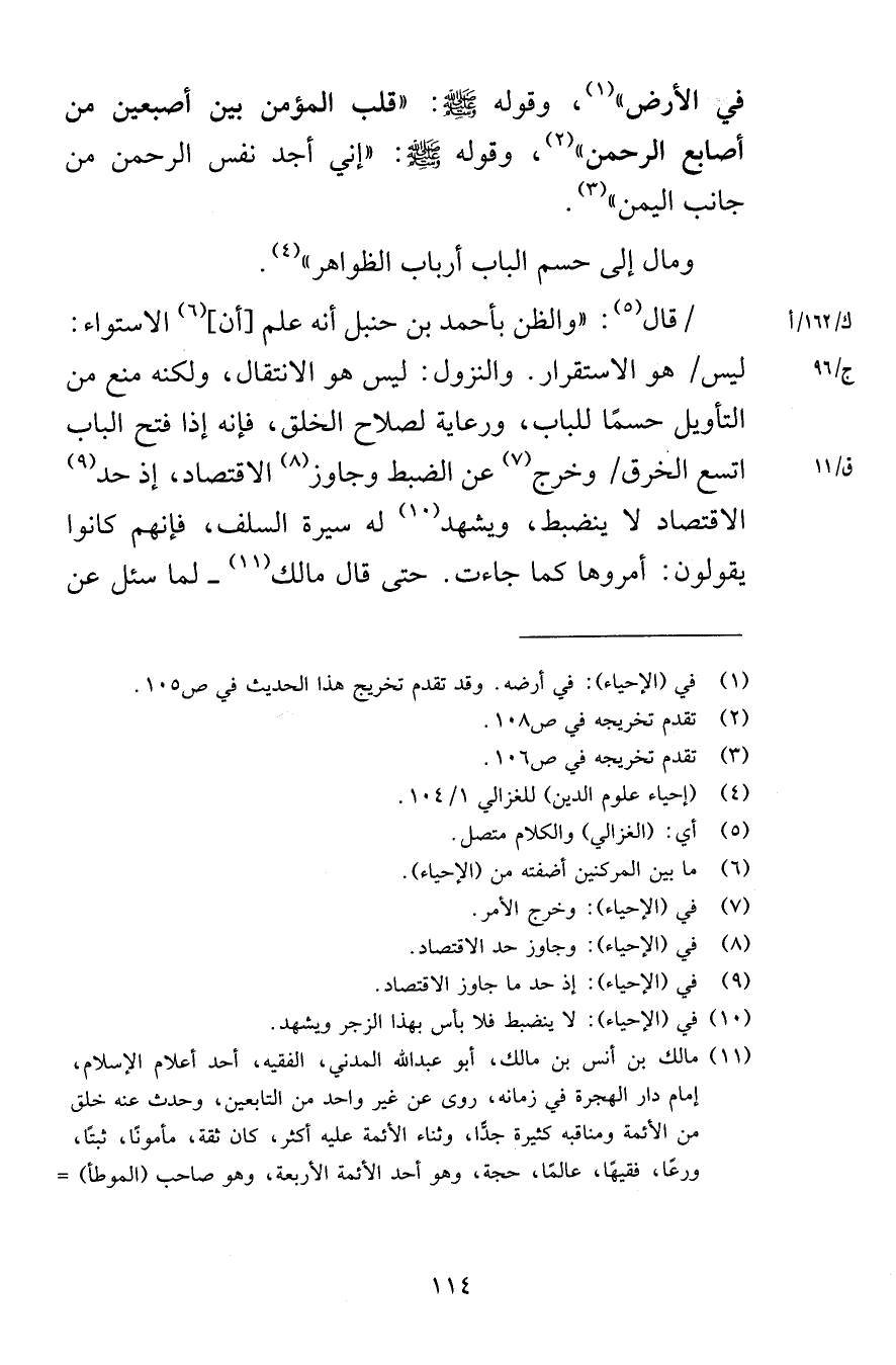 في الأرض وقوله صلى الله عليه وسلم قلب المؤمن بين أصبعين من أصابع الرحمن وقوله صلى الله عليه وسلم إني أجد نفس الرحمن من جانب اليمن ومال إلى حسم الباب أرباب الظواهر قال والظن بأحمد بن حنبل أنه علم أن الاستواء ليس هو الاستقرار والنزول ليس هو الانتقال ولكنه منع من التأويل حسمًا للباب ورعاية لصلاح الخلق فإنه إذا فتح الباب اتسع الخرق وخرج عن الضبط وجاوز الاقتصاد إذ حد الاقتصاد لا ينضبط ويشهد له سيرة السلف فإنهم كانوا يقولون أمروها كما جاءت حتى قال مالك لما سئل عن
