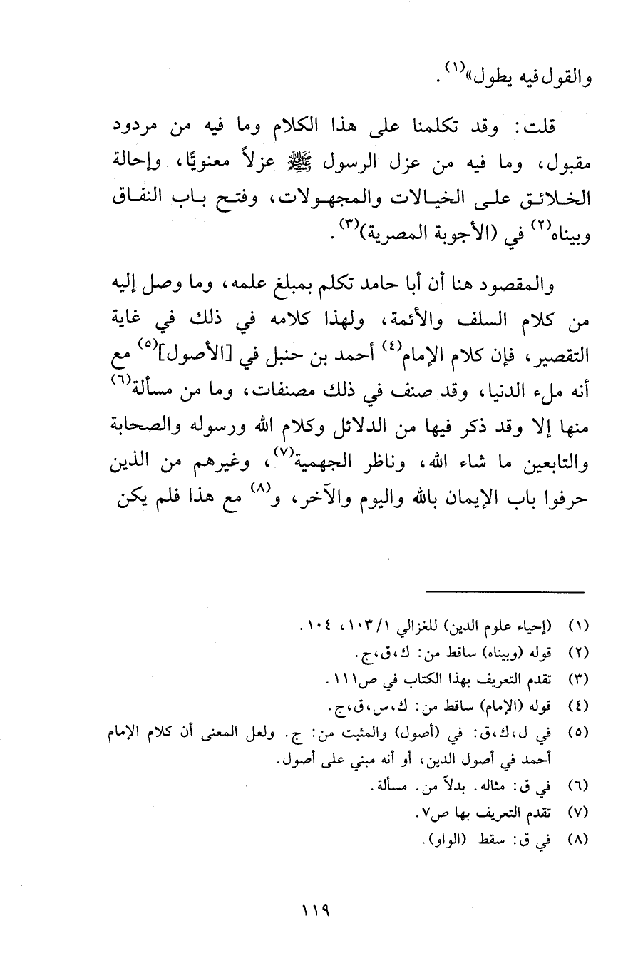 والقول فيه يطول قلت وقد تكلمنا على هذا الكلام وما فيه من مردود مقبول وما فيه من عزل الرسول صلى الله عليه وسلم عزلاً معنويًّا وإحالة الخلائق على الخيالات والمجهولات وفتح باب النفاق وبيناه في الأجوبة المصرية والمقصود هنا أن أبا حامد تكلم بمبلغ علمه وما وصل إليه من كلام السلف والأئمة ولهذا كلامه في ذلك في غاية التقصير فإن كلام الإمام أحمد بن حنبل في الأصول مع أنه ملء الدنيا وقد صنف في ذلك مصنفات وما من مسألة منها إلا وقد ذكر فيها من الدلائل وكلام الله ورسوله والصحابة والتابعين وما شاء الله وناظر الجهمية وغيرهم من الذين حرفوا باب الإيمان بالله واليوم الآخر ومع هذا فلم يكن