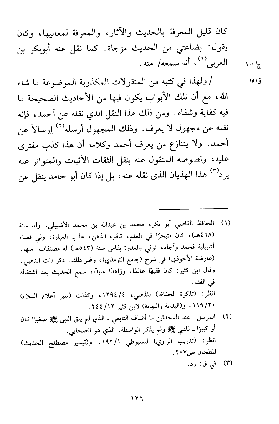 كان قليل المعرفة بالحديث والآثار والمعرفة لمعانيها وكان يقول بضاعتي من الحديث مزجاة كما نقل عنه أبوبكر بن العربي أنه سمعه منه ولهذا في كتبه من المنقولات المكذوبة الموضوعة ما شاء الله مع أن تلك الأبواب يكون فيها من الأحاديث الصحيحة ما فيه كفاية وشفاء ومن ذلك هذا النقل الذي نقله عن أحمد فإنه نقله عن مجهول لا يعرف وذلك المجهول أرسله إرسالاً عن أحمد ولا يتنازع من يعرف أحمد وكلامه أن هذا كذب مفترى عليه ونصوصه المنقول عنه بنقل الثقات الأثبات والمتواتر عنه يرد هذا الهذيان الذي نقله عنه بل إذا كان أبو حامد ينقل عن