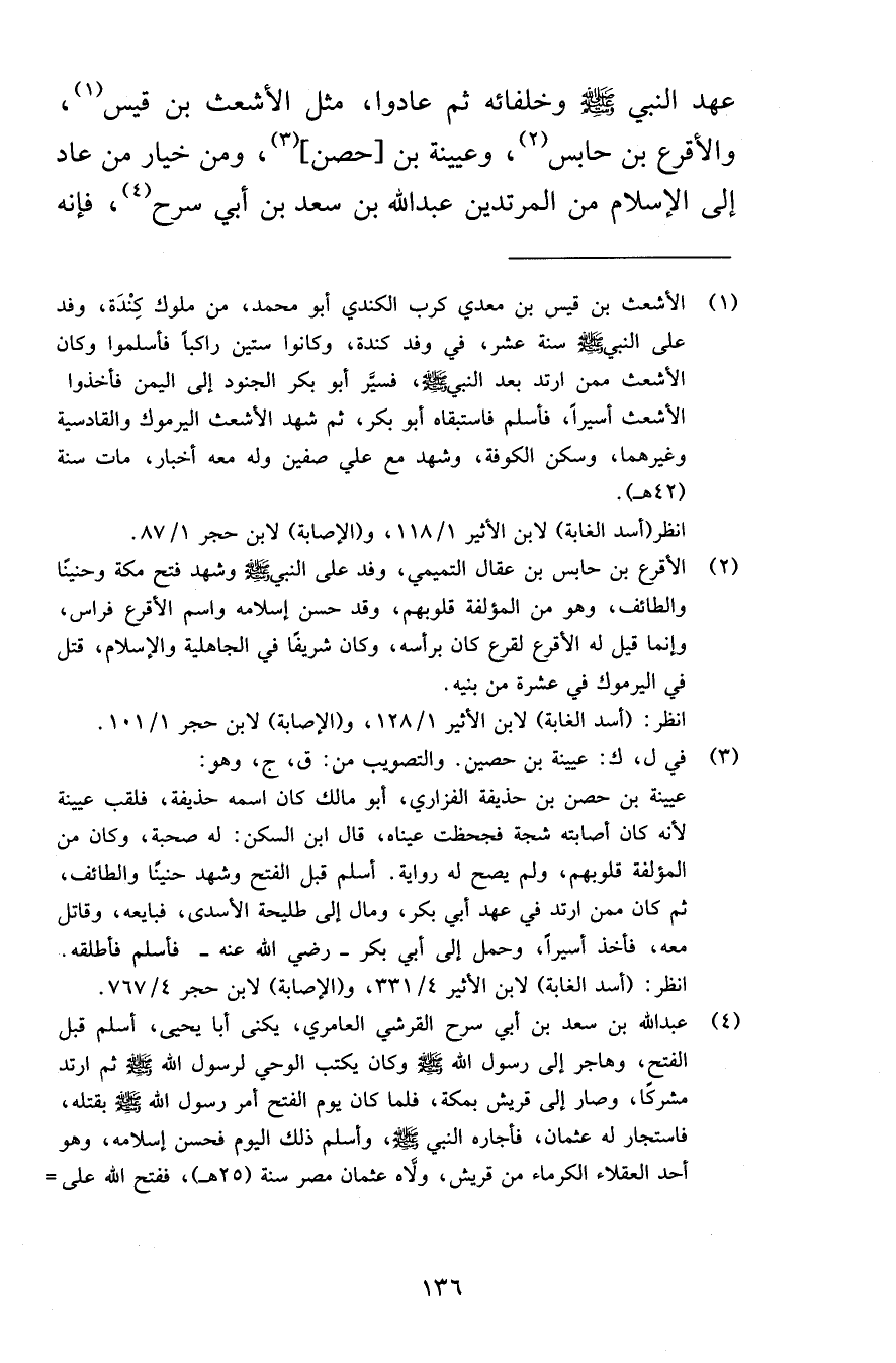 عهد النبي صلى الله عليه وسلم وخلفائه ثم عادوا مثل الأشعث بن قيس والأقرع بن حابس وعيينة بن حصن ومن خيار من عاد إلى الإسلام من المرتدين عبد الله بن سعد ين أبي سرح فإنه