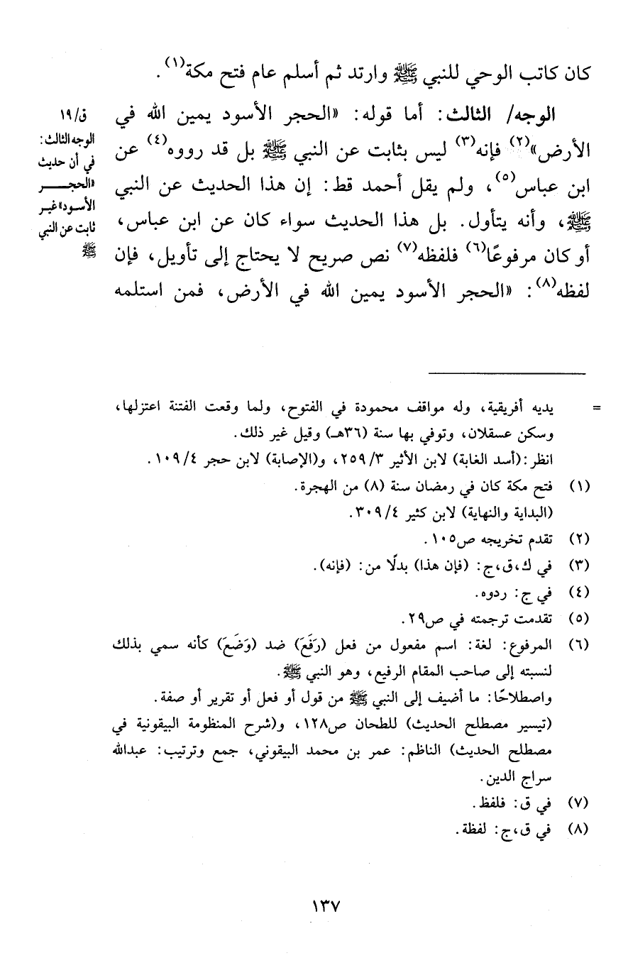 كان كاتب الوحي للنبي صلى الله عليه وسلم وارتد ثم أسلم عام فتح مكة الوجه الثالث أما قوله الحجر الأسود يمين الله في الأرض فإنه ليس بثابت عن النبي صلى الله عليه وسلم بل قد رووه عن ابن عباس ولم يقل أحمد قط إن هذا الحديث عن النبي صلى الله عليه وسلم وأنه يتأول بل هذا الحديث سواء كان عن ابن عباس أو كان مرفوعًا فلفظه نص صريح لا يحتاج إلى تأويل فإن لفظه الحجر الأسود يمين الله في الأرض فمن استلمه
