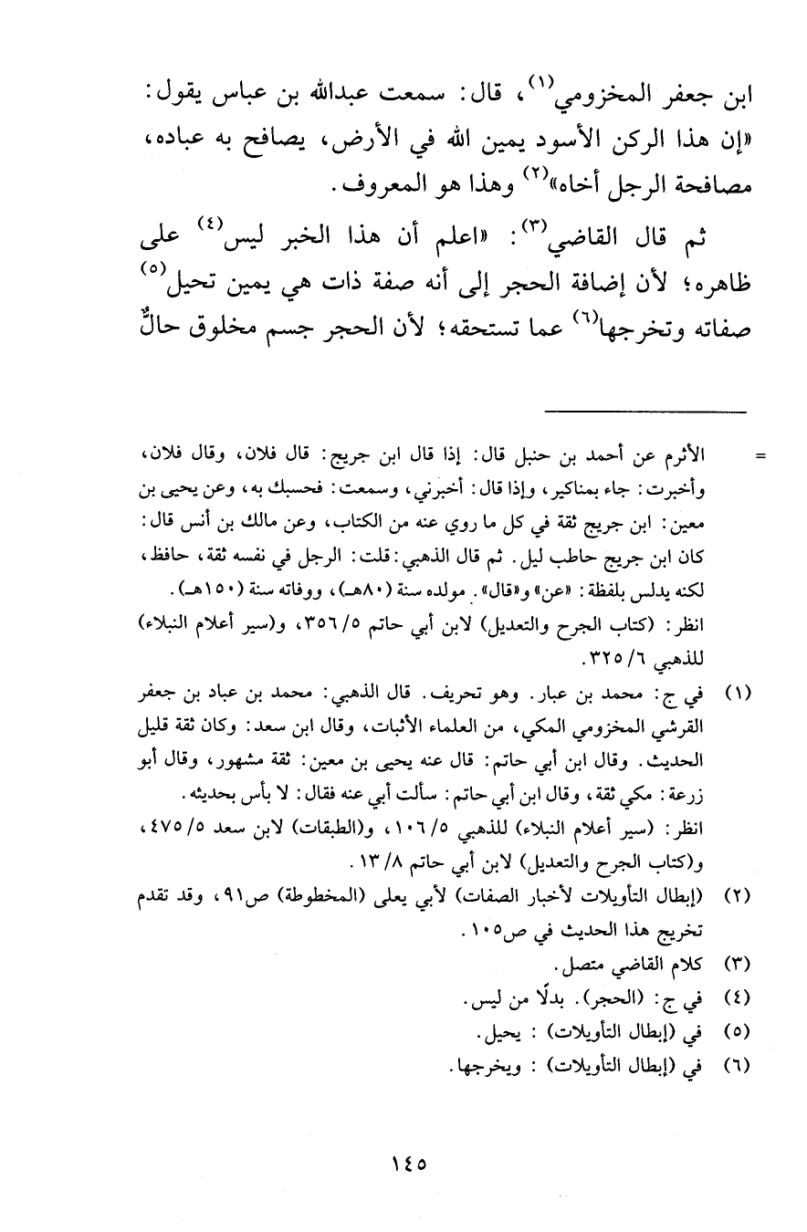 ابن جعفر المخزومي قال سمعت عبد الله بن عباس يقول إن هذا الركن الأسود يمين الله في الأرض يصافح به عباده مصافحة الرجل أخاه وهذا هو المعروف ثم قال القاضي اعلم أن هذا الخبر ليس على ظاهره لأن إضافة الحجر إلى أنه صفة ذات هي يمين تحيل صفاته وتخرجها عما تستحقه لأن الحجر جسم مخلوق حالٌّ