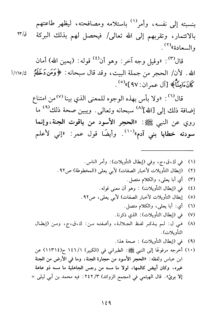 بنسبته إلى نفسه وأمر باستلامه ومصافحته ليظهر طاعتهم بالائتمار وتقربهم إلى الله تعالى فيحصل لهم بذلك البركة والسعادة قال وقيل وجه آخر وهو أن قوله يمين الله أمان الله لأن الحجر من جملة البيت وقد قال سبحانه وَمَنْ دَخَلَهُ كَانَ آمِنًا [آل عمران 97] قال ولا بأس بهذه الوجوه للمعنى الذي بينا من امتناع إضافة ذلك إلى الله سبحانه وتعالى ويبين صحة ذلك ما روي عن النبي صلى الله عليه وسلم الحجر الأسود من ياقوت الجنة وإنما سودته خطايا بني آدم وأيضًا قول عمر إني لأعلم