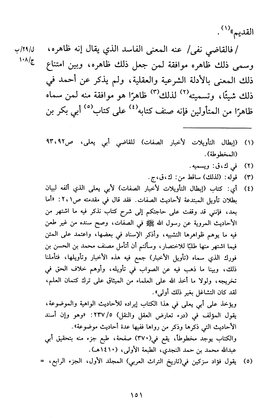 القديم فالقاضي نفى عنه المعنى الفاسد الذي يقال إنه ظاهره وسمى ذلك ظاهره موافقة لمن جعل ذلك ظاهره وبين امتناع ذلك المعنى بالأدلة الشرعية والعقلية ولم يذكر عن أحمد في ذلك شيئًا وتسميته لذلك ظاهرًا هو موافقة منه لمن سماه ظاهرًا من المتأولين فإنه صنف كتابه على كتاب أبي بكر بن
