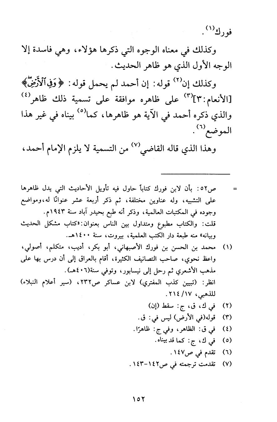 فورك وكذلك في معناه الوجوه التي ذكرها هؤلاء وهي فاسدة إلا الوجه الأول الذي هو ظاهر الحديث وكذلك إن قوله ‘ن أحمد لم يحمل قوله وَفِي الْأَرْضِ [الأنعام 3] على ظاهره موافقة على تسمية ذلك ظاهر والذي ذكره أحمد في الآية هو ظاهرها كما بيناه في غير هذا الموضع وهذا الذي قاله القاضي من التسمية لا يلزم الإمام أحمد