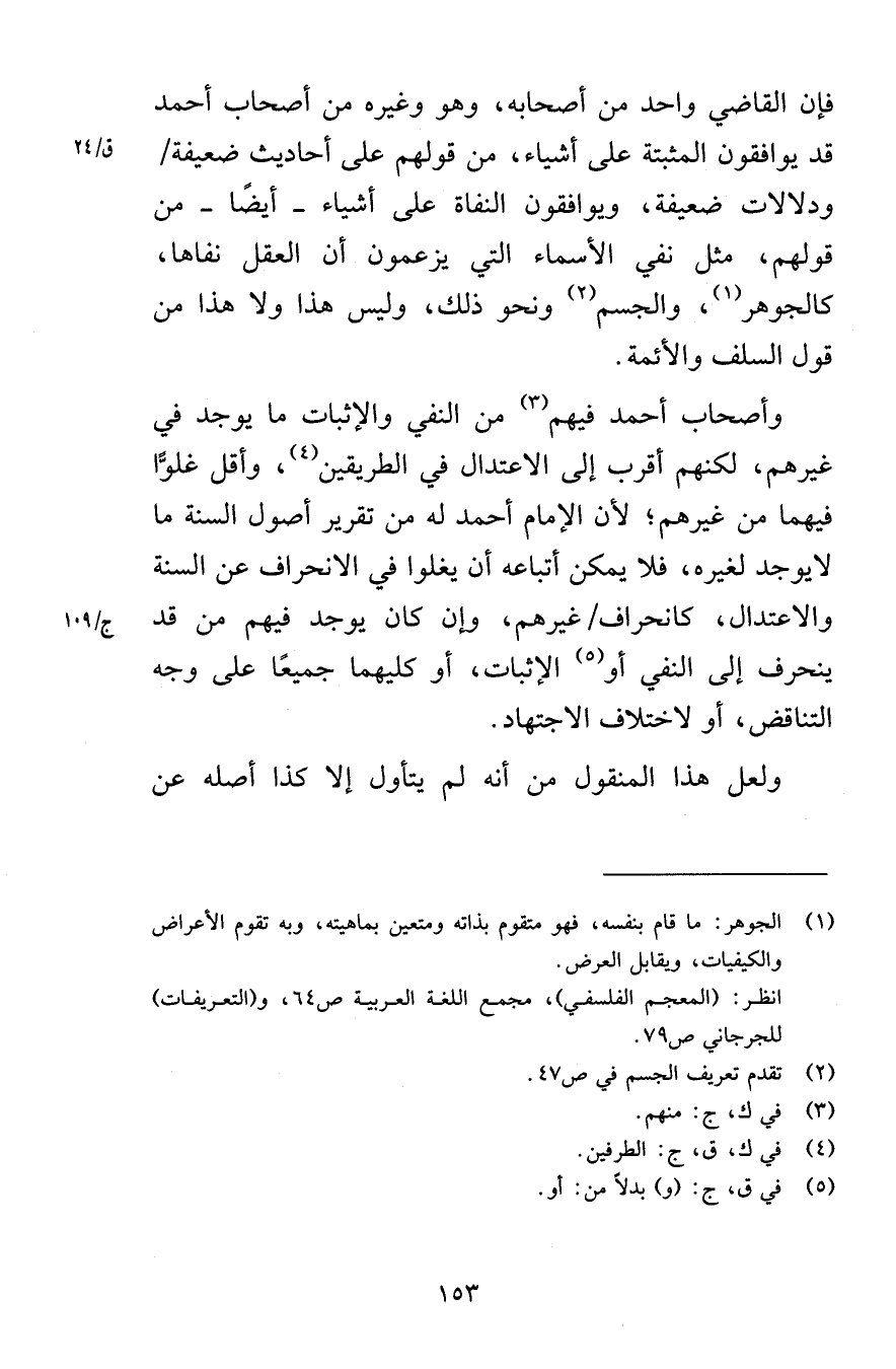 فإن القاضي واحد أصحابه وهو وغيره من أصحاب أحمد قد يوافقون المثبتة على أشياء من قولهم على أحاديث ضعيفة ودلالات ضعيفة ويوافقون النفاة على أشياء أيضًا من قولهم مثل نفي الأسماء التي يزعمون أن العقل نفاها كالجوهر والجسم ونحو ذلك وليس هذا ولا هذا من قول السلف والأئمة وأصحاب أحمد فيهم من النفي والإثبات ما يوجد في غيرهم لكنهم أقرب إلى الاعتدال في الطريقين وأقل غلوًّا فيهما من غيرهم لأن الإمام أحمد له من تقرير أصول السنة ما لايوجد لغيره فلا يمكن أتباعه أن يغلوا في الانحراف عن السنة والاعتدال كانحراف غيرهم وإن كان يوجد فيهم من قد ينحرف إلى النفي أو الإثبات أو كليهما جميعًا على وجه التناقض أو لاختلاف الاجتهاد ولعل هذا المنقول من أنه لم يتأول إلا كذا أصله عن