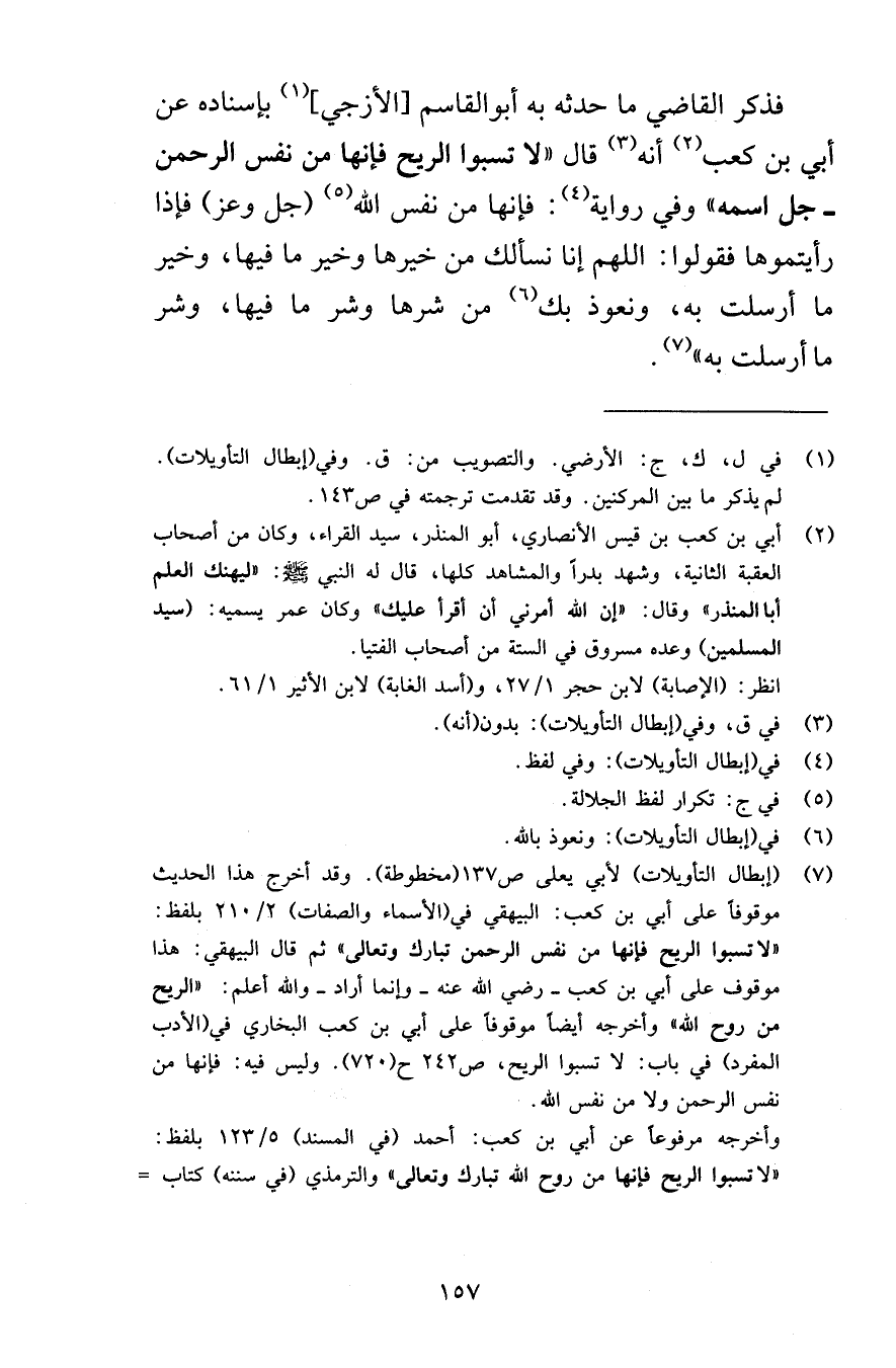 فذكر القاضي ما حدثه به أبوالقاسم الأزجي بإسناده عن أبي بن كعب أنه قال لا تسبوا الريح فإنها من نفس الرحمن جل اسمه وفي رواية فإنها من نفس الله جل وعز فإذا رأيتموها فقولوا اللهم إنا نسألك من خيرها وخير ما فيها وخير ما أرسلت به ونعوذ بك من شرها وشر ما فيها وشر ما أرسلت به