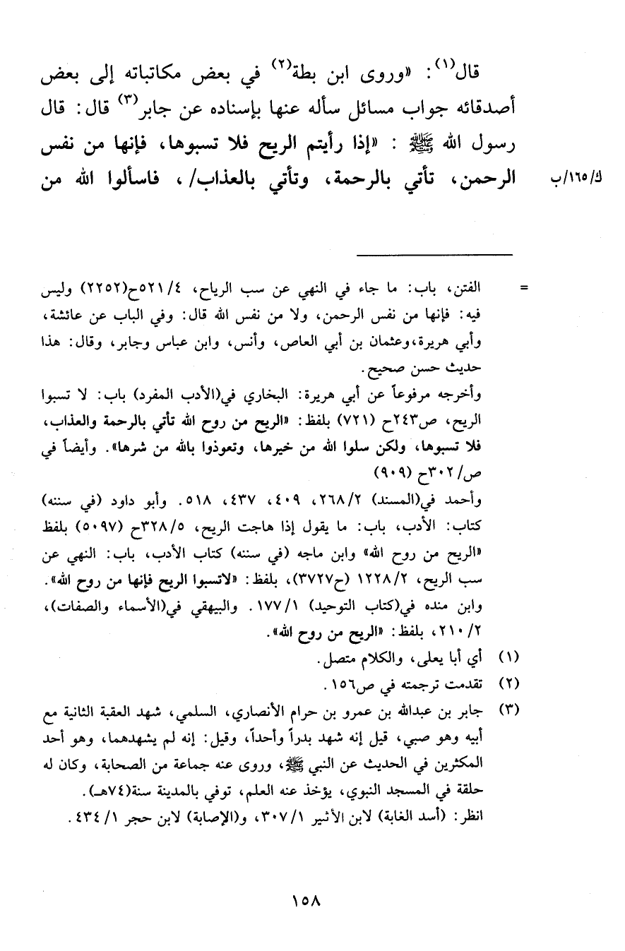 قال وروى ابن بطة في بعض مكاتباته إلى بعض أصدقائه جواب مسائل سأله عنها بإسناده عن جابر قال قال رسول الله صلى الله عليه وسلم إذا رأيتم الريح فلا تسبوها فإنها من نفس الرحمن تأتي بالرحمة وتأتي بالعذاب فاسألوا الله من