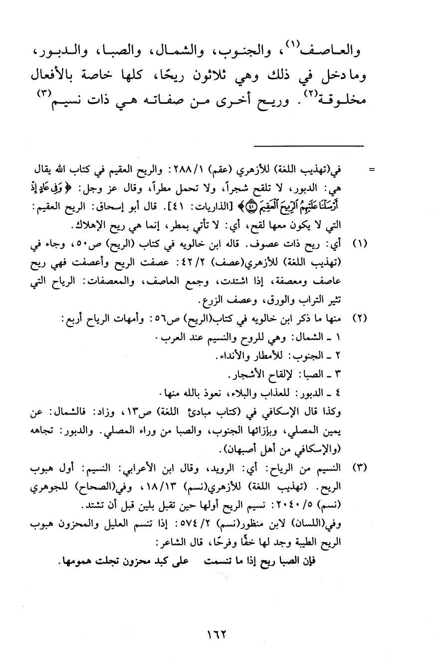 والعاصف والجنوب والشمال والصبا والدبور وما دخل في ذلك وهي ثلاثون ريحًا كلها خاصة بالأفعال مخلوقة وريح أخرى من صفاته هي ذات نسيم