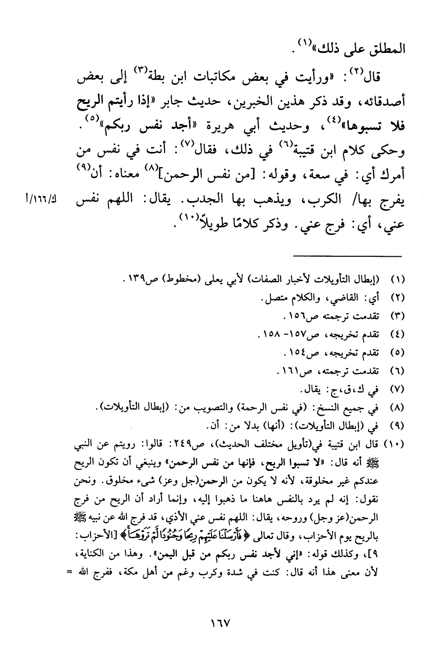 المطلق على ذلك قال ورأيت في بعض مكاتبات ابن بطة إلى بعض أصدقائه وقد ذكر هذين الخبرين حديث جابر إذا رأيتم الريح فلا تسبوها وحديث ابن هريرة أجد نفس ربكم وحكى كلام ابن قتيبة في ذلك فقال أنت في نفس من أمرك أي في سعة وقوله من نفس الرحمن معناه أن يفرج بها الكرب ويذهب بها الجدب يقال اللهم نفس عني أي فرج عني وذكر كلامًا طويلاً