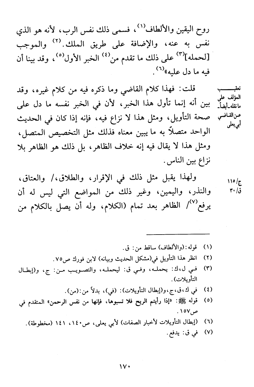 روح اليقين والألطاف فسمى ذلك نفس الرب لأنه هو الذي نفس به عنه والإضافة إلى طريق الملك والموجب لحمله على ذلك ما تقدم من الخبر الأول وقد بينا أن فيه ما دل عليه قلت فهذا كلام القاضي وما ذكره فيه من كلام غيره وقد بين أنه إنما تأول هذا الخبر لأن في الخبر نفسه ما دل على صحة التأويل ومثل هذا لا نزاع فيه فإنه إذا كان في الحديث الواحد متصلاً به ما يبين معناه فذلك مثل التخصيص المتصل ومثل هذا لا يقال فيه إنه خلاف الظاهر بل ذلك هو الظاهر بلا نزاع بين الناس ولهذا يقبل مثل ذلك في الإقرار والطلاق والعتاق والنذر واليمين وغير ذلك من المواضع التي ليس له أن يرفع الظاهر بعد تمام الكلام وله أن يصل بالكلام من