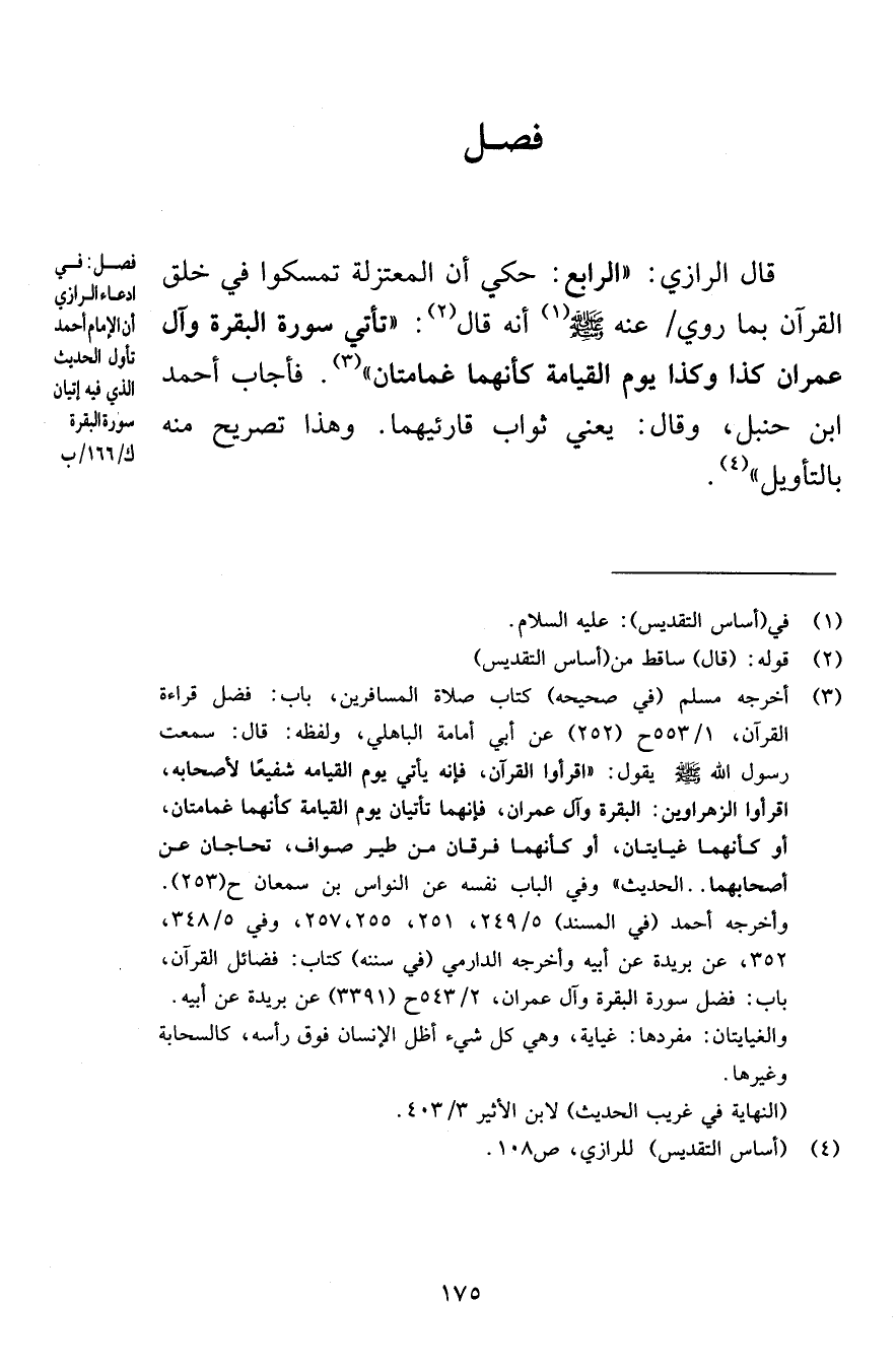 فصل قال الرازي الرابع حكي أن المعتزلة تمسكوا في خلق القرآن بما روي عنه صلى الله عليه وسلم أنه قال تأتي سورة البقرة وآل عمران كذا وكذا يوم القيامة كأنهما غمامتان فأجاب أحمد ابن حنبل وقال يعني ثواب قارئيهما وهذا تصريح منه بالتأويل