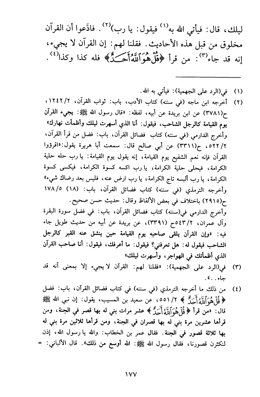 ليلك قال فيأتي الله به فيقول يا رب فادَّعوا أن القرآن مخلوق من هذه الأحاديث فقلنا لهم إن القرآن لا يجيء إنه قد جاء من قرأ قُلْ هُوَ اللَّهُ أَحَدٌ فله كذا وكذا