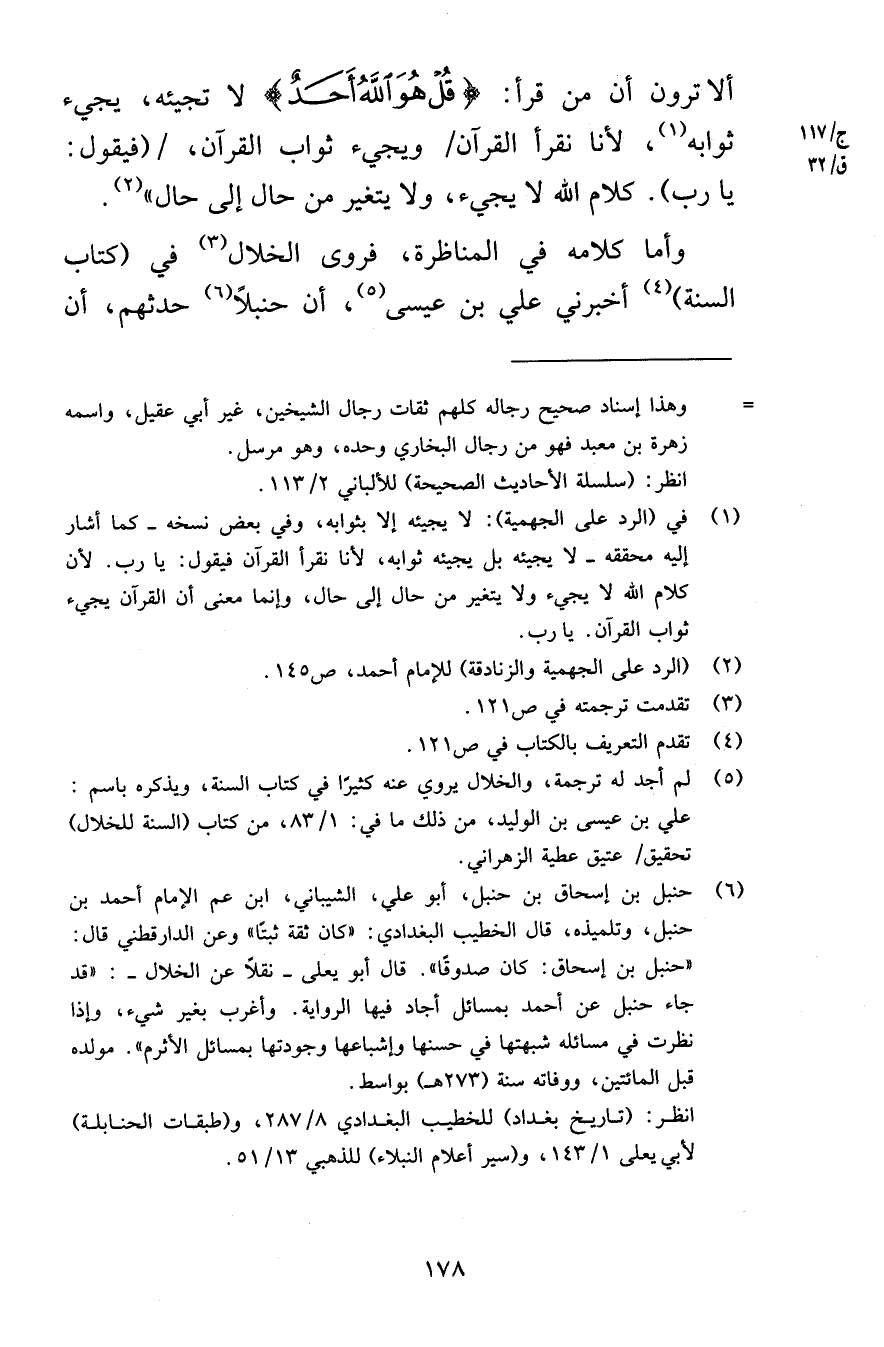 ألا ترون أن من قرأ قُلْ هُوَ اللَّهُ أَحَدٌ لا تجيئه يجيء ثوابه لأنا نقرأ القرآن ويجيء ثواب القرآن فيقول يا رب كلام الله لا يجيء ولا يتغير من حال إلى حال وأما كلامه في المناظرة فروى الخلال في كتاب السنة أخبرني علي بن عيسى أن حنبلاً حدثهم أن