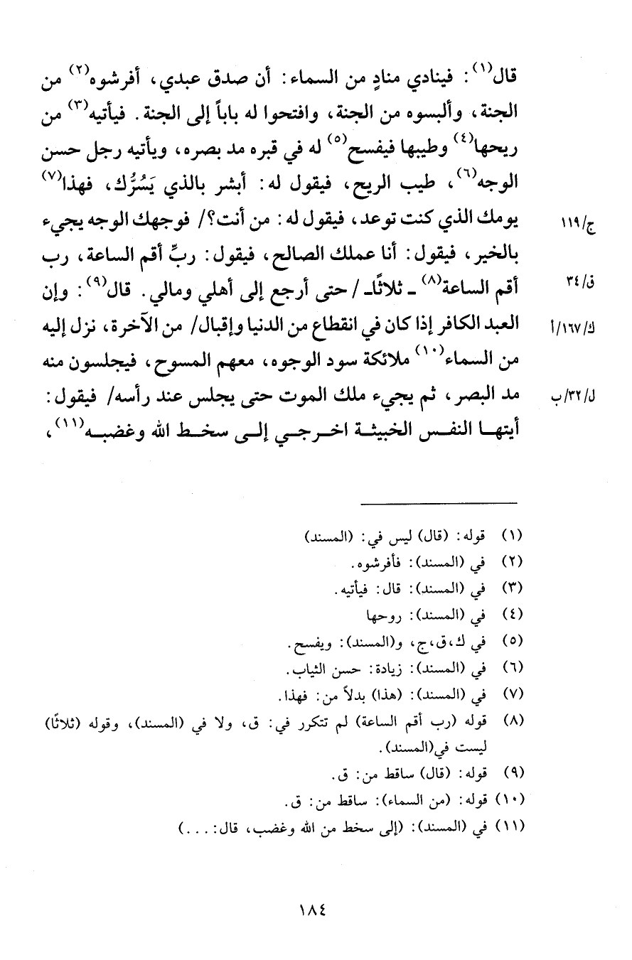 قال فينادي منادٍ من السماء أن صدق عبدي أفرشوه من الجنة وألبسوه من الجنة وافتحوا له باباً إلى الجنة فيأتيه من ريحها وطيبها فيفسح له في قبره مد بصره ويأتيه رجل حسن الوجه طيب الريح فيقول له أبشر بالذي يَسُرُّك فهذا يومك الذي كنت توعد فيقول له من أنت فوجهك الوجه يجيء بالخير فيقول أنا عملك الصالح فيقول ربِّ أقم الساعة رب أقم الساعة ثلاثًا حتى أرجع إلى أهلي ومالي قال وإن العبد الكافر إذا كان في انقطاع من الدنيا وإقبال من الآخرة نزل إليه من السماء ملائكة سود الوجوه معهم المسوح فيجلسون منه مد البصر ثم يجيء ملك الموت حتى يجلس عند رأسه فيقول أيتها النفس الخبيثة اخرجي إلى سخط الله وغضبه