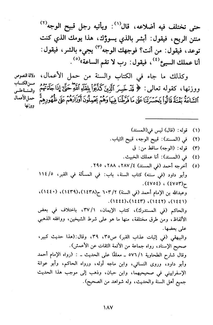 حتى تختلف فيه أضلاعه قال ويأتيه رجل قبيح الوجه منتن الريح فيقول أبشر بالذي يسوؤك هذا يومك الذي كنت توعد فيقول من أنت فوجهك الوجه يجيء بالشر فيقول أنا عملك السيئ فيقول رب لا تقم الساعة وكذلك ما جاء في الكتاب والسنة من حمل الأعمال ووزنها كقوله تعالى قَدْ خَسِرَ الَّذِينَ كَذَّبُوا بِلِقَاءِ اللَّهِ حَتَّى إِذَا جَاءَتْهُمُ السَّاعَةُ بَغْتَةً قَالُوا يَا حَسْرَتَنَا عَلَى مَا فَرَّطْنَا فِيهَا وَهُمْ يَحْمِلُونَ أَوْزَارَهُمْ عَلَى ظُهُورِهِمْ