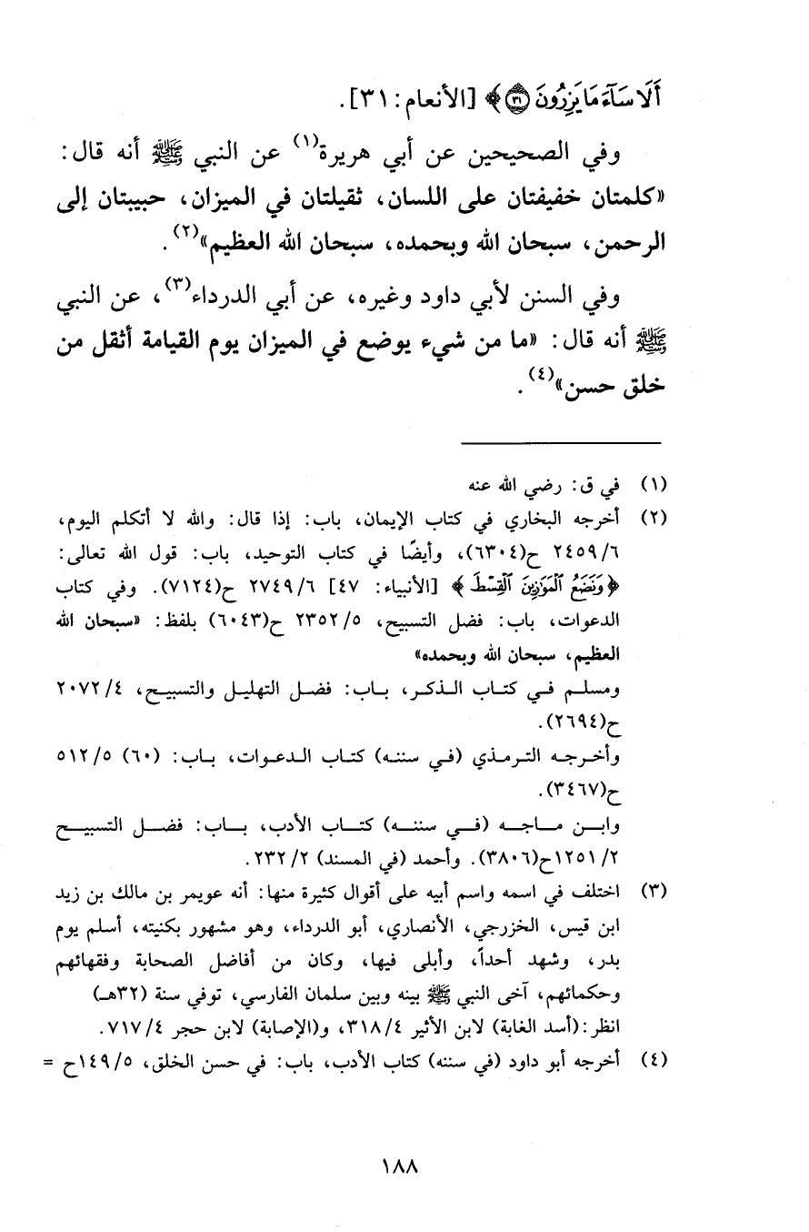 أَلَا سَاءَ مَا يَزِرُونَ (31) [الأنعام 31] وفي الصحيحين عن أبي هريرة عن النبي صلى الله عليه وسلم أنه قال كلمتان خفيفتان على اللسان ثقيلتان في الميزان حبيبتان إلى الرحمن سبحان الله وبحمده سبحان الله العظيم وفي السنن لأبي داود وغيره عن أبي الدرداء عن النبي صلى الله عليه وسلم أنه قال ما من شيء يوضع في الميزان يوم القيامة أثقل من خلق حسن