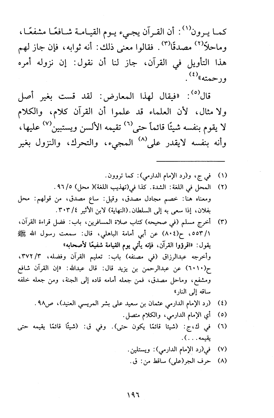 كما يرون أن القرآن يجيء يوم القيامة شافعًا مشفعًا وماحلاً مصدقًا فقالوا معنى ذلك أنه ثوابه فإن جاز لهم هذا التأويل في القرآن جاز لنا أن نقول إنا نزوله أمره ورحمته قال فيقال لهذا المعارض لقد قست بغير أصل ولا مثال لأن العلماء قد علموا أن القرآن كلام والكلام لا يقوم بنفسه شيئًا قائماً حتى تقيمه الألسن ويستبين عليها وأنه بنفسه لا يقدر على المجيء والتحرك والنزول بغير