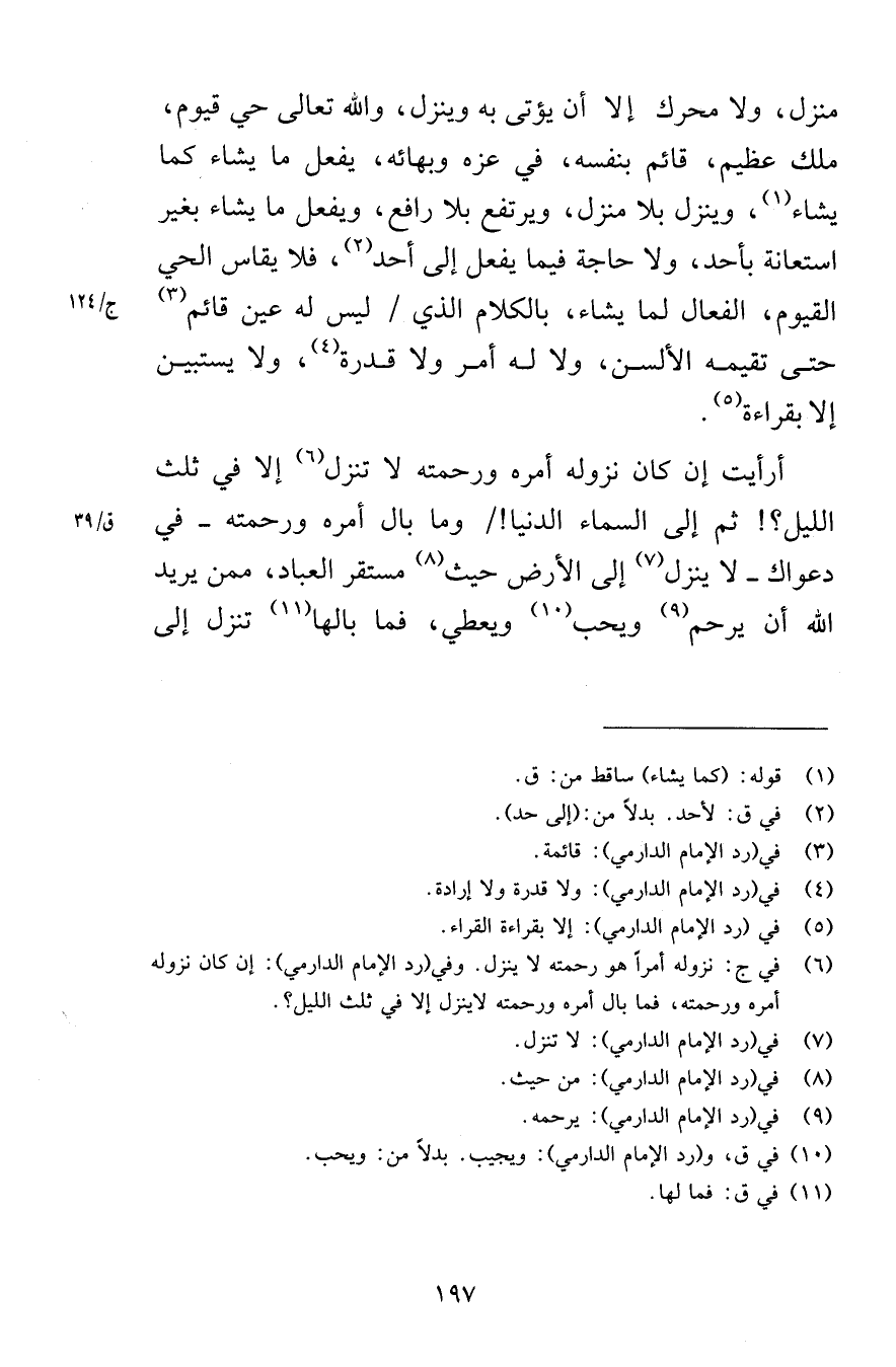 منزل ولا محرك إلا أن يؤتى به وينزل والله تعالى حي قيوم ملك عظيم قائم بنفسه في عزه وبهائه يفعل ما يشاء كما يشاء وينزل بلا منزل ويرتفع بلا رافع ويفعل ما يشاء بغير استعانة بأحد ولا حاجة فيما يفعل إلى أحد فلا يقاس الحي القيوم الفعال لما يشاء بالكلام الذي ليس له عين قائم حتى تقيمه الألسن ولا له أمر ولا قدرة ولا يستبين إلا بقراءة أرأيت إن كان نزوله أمره ورحمته لا تنزل إلا في ثلث الليل ثم إلى السماء الدنيا وما بال أمره ورحمته في دعواك لا ينزل إلى الأرض حيث مستقر العباد ممن يريد الله أن يرحم ويحب ويعطي فما بالها تنزل إلى