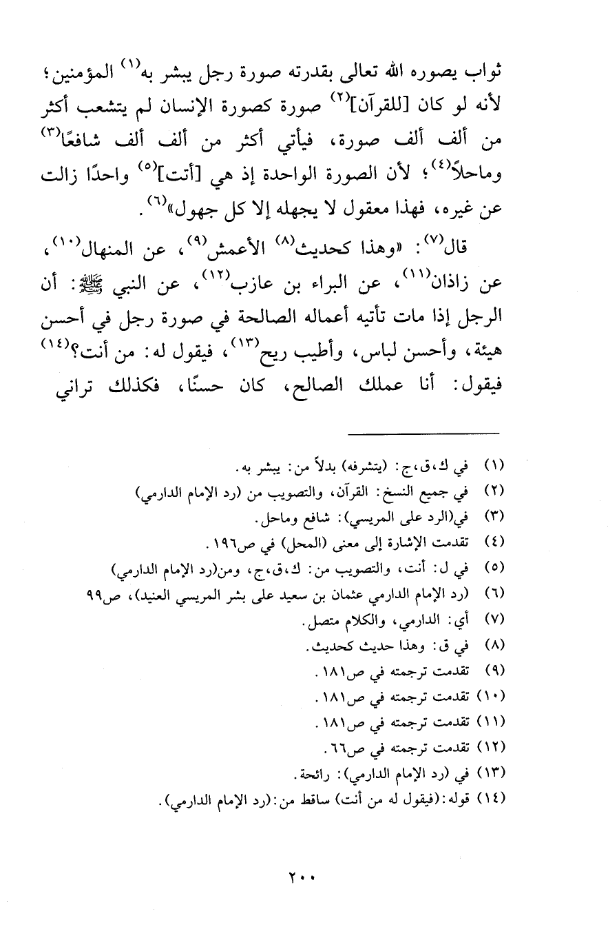 ثواب يصوره الله تعالى بقدرته صورة رجل يبشر به المؤمنين لأنه لو كان للقرآن صورة كصورة الإنسان لم يتشعب أكثر من ألف ألف صورة فيأتي أكثر من ألف ألف شافعًا وماحلاً لأن الصورة الواحدة إذ هي أتت واحدًا زالت عن غيره فهذا معقول لا يجهله إلا كل جهول قال وهذا كحديث الأعمش عن المنهال عن زاذان عن البراء بن عازب عن النبي صلى الله عليه وسلم أن الرجل إذا مات تأتيه أعماله الصالحة في صورة رجل في أحسن هيئة وأحسن لباس وأطيب ريح فيقول له من أنت فيقول أنا عملك الصالح كان حسنًا فكذلك تراني