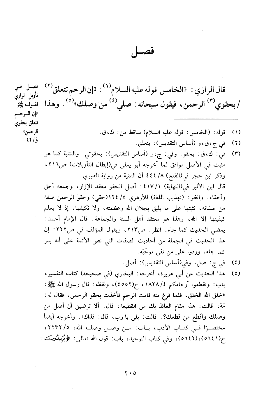 فصل قال الرازي الخامس قوله عليه السلام إن الرحم تتعلق بحقوي الرحمن فيقول سبحانه صلي من وصلك وهذا