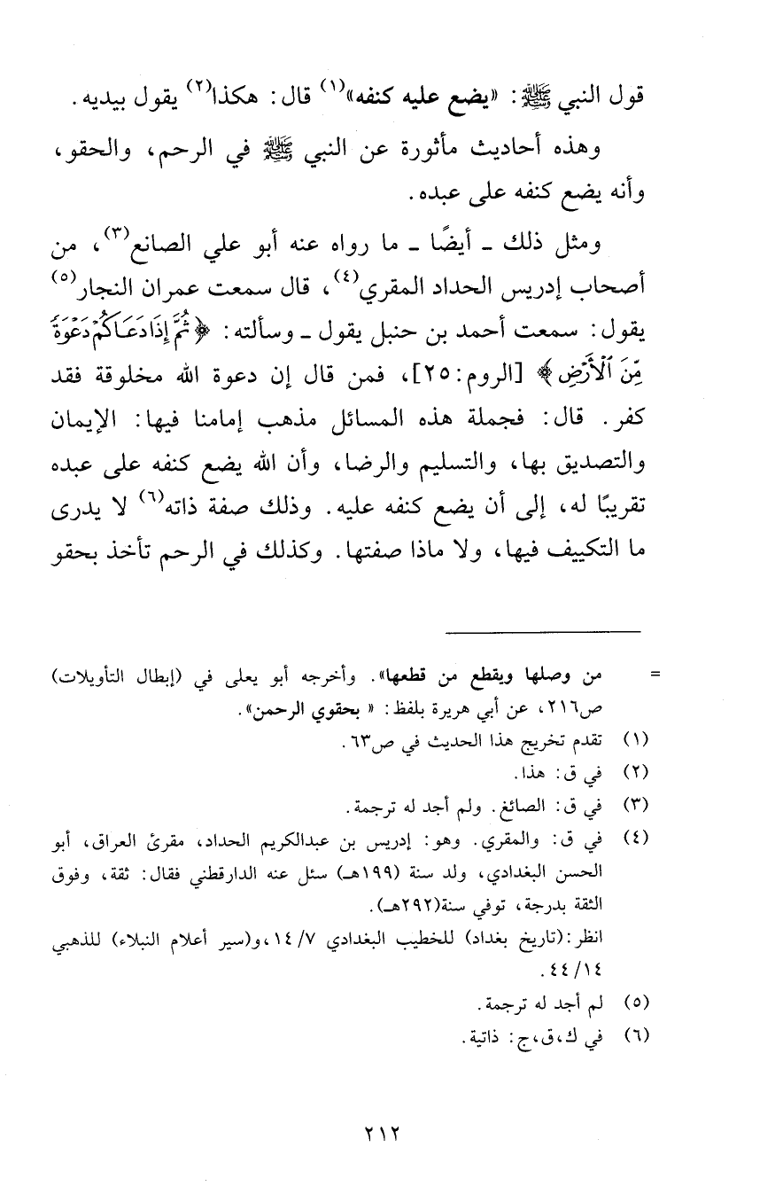 قول النبي صلى الله عليه وسلم يضع عليه كنفه قال هكذا يقول بيديه وهذه أحاديث مأثورة عن النبي صلى الله عليه وسلم في الرحم والحقو وأنه يضع كنفه على عبده ومثل ذلك أيضًا ما رواه عنه أبو علي الصانع من أصحاب إدريس الحداد المقري قال سمعت عمران النجار يقول سمعت أحمد بن حنبل يقول وسألته ثُمَّ إِذَا دَعَاكُمْ دَعْوَةً مِنَ الْأَرْضِ [الروم 25] فمن قال إن دعوة الله مخلوقة فقد كفر قال فجملة هذه المسائل مذهب إمامنا فيها الإيمان والتصديق بها والتسليم والرضا وأن الله يضع كنفه على عبده تقريبًا له إلى أن يضع كنفه عليه وذلك صفة ذاته لا يدري ما التكييف فيها ولا ماذا صفتها وكذلك في الرحم تأخذ بحقو