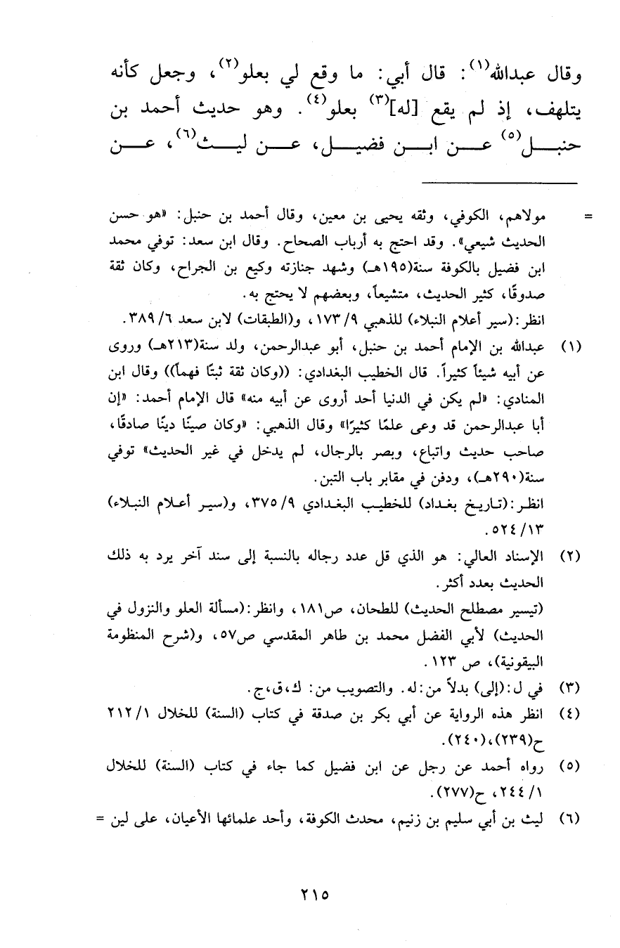 وقال عبد الله قال أبي ما وقع لي بعلو وجعل كأنه يتلهف إذ لم يقع له بعلو وهو حديث أحمد بن حنبل عن ابن فضيل عن ليث عن
