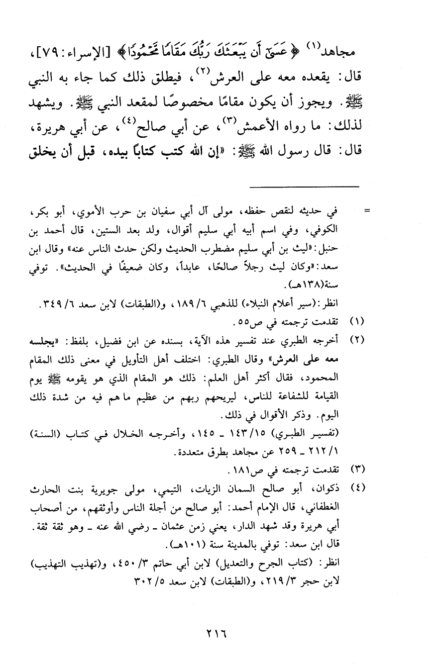 مجاهد عَسَى أَنْ يَبْعَثَكَ رَبُّكَ مَقَامًا مَحْمُودًا (79) [الإسراء 79] قال يقعده معه على العرش فيطلق ذلك كما جاء به النبي صلى الله عليه وسلم ويجوز أن يكون مقامًا مخصوصًا لمقعد النبي صلى الله عليه وسلم ويشهد لذلك ما رواه الأعمش عن أبي صالح عن أبي هريرة قال قال رسول الله صلى الله عليه وسلم إن الله كتب كتابًا بيده قبل أن يخلق