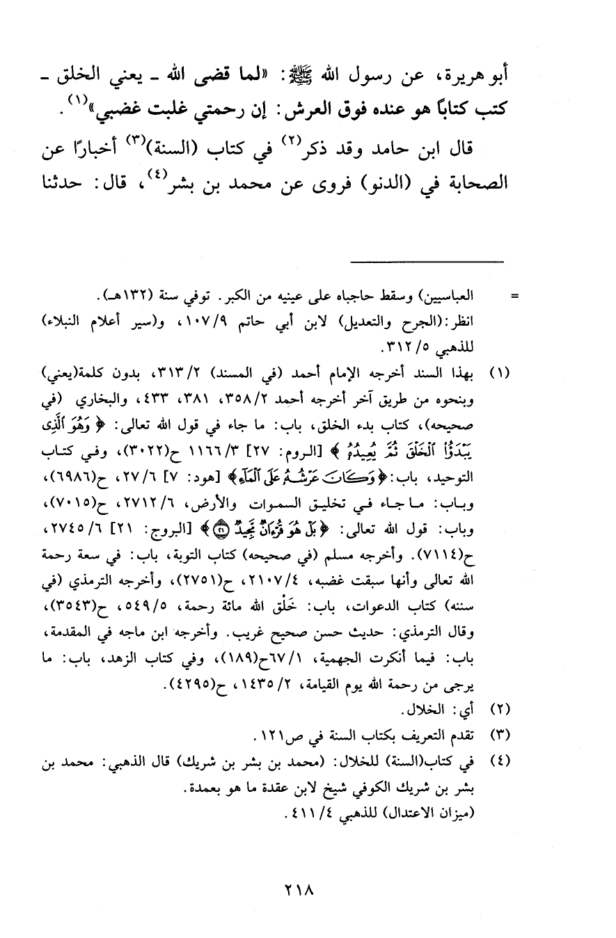 أبو هريرة عن رسول الله صلى الله عليه وسلم لما قضى الله يعني الخلق كتب كتابًا هو عنده فوق العرش إن رحمتي غلبت غضبي قال ابن حامد وقد ذكر في كتاب السنة أخبارًا عن الصحابة في الدنو فروى عن محمد بن بشر قال حدثنا