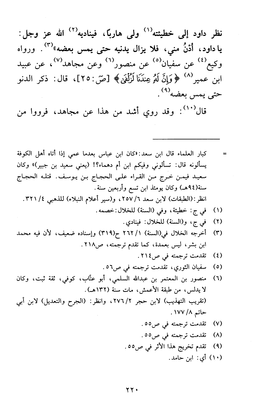 نظر داود إلى خطيئته ولى هاربًا فيناديه الله عز وجل يا داود اُدْنُ مني فلا يزال يدنيه حتى يمس بعضه ورواه وكيع عن سفيان عن منصور وعن مجاهد عن عبيد ابن عمير وَإِنَّ لَهُ عِنْدَنَا لَزُلْفَى [ص 25] قال ذكر الدنو حتى يمس بعضه قال وقد روي أشد من هذا عن مجاهد فرووا منه