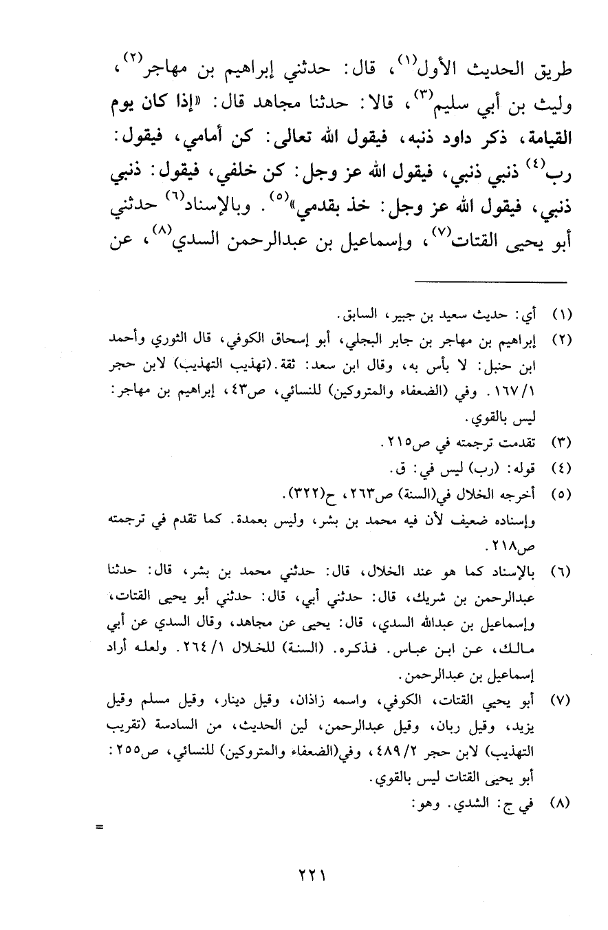 طريق الحديث الأول قال حدثني إبراهيم بن مهاجر وليث بن أبي سليم قالا حدثنا مجاهد قال إذا كان يوم القيامة ذكر داود ذنبه فيقول الله تعالى كن أمامي فيقول ذنبي ذنبي فيقول الله عز وجل كن خلفي فيقول ذنبي ذنبي فيقول الله عز وجل خذ بقدمي وبالإسناد حدثني أبو يحيى القتات وإسماعيل بن عبد الرحمن السدي عن