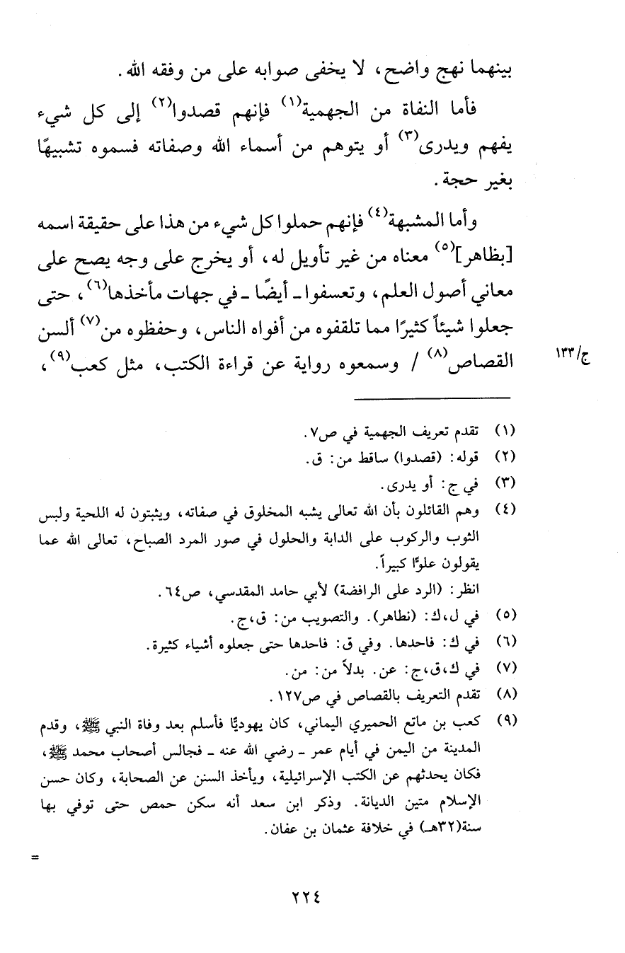 بينهما نهج واضح لا يخفى صوابه على من وفقه الله فأما النفاة من الجهمية فإنهم قصدوا إلى كل شيء يفهم ويدري أو يتوهم من أسماء الله وصفاته فسموه تشبيهًا بغير حجة وأما المشبهة فإنهم حملوا كل شيء من هذا على حقيقة اسمه بظاهر معناه من غير تأويل له أو يخرج على وجه يصح على معاني أصول العلم وتعسفوا أيضًا في جهات مأخذها حتى جعلوا شيئاً كثيرًا مما تلقفوه من أفواه الناس وحفظوه من ألسن القصاص وسمعوه رواية عن قراءة الكتب مثل كعب