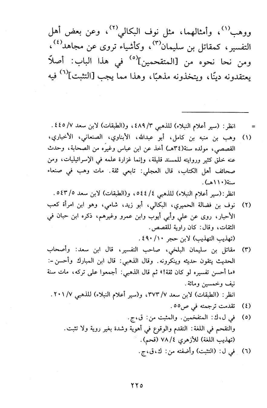 ووهب وأمثالهما مثل نوف البكالي وعن بعض أهل التفسير كمقاتل بن سليمان وكأشياء تروى عن مجاهد ومن نحا نحوه من المقتحمين في هذا الباب أصلاً يعتقدونه دينًا ويتخذونه مذهبًا وهذا مما يجب التثبت فيه