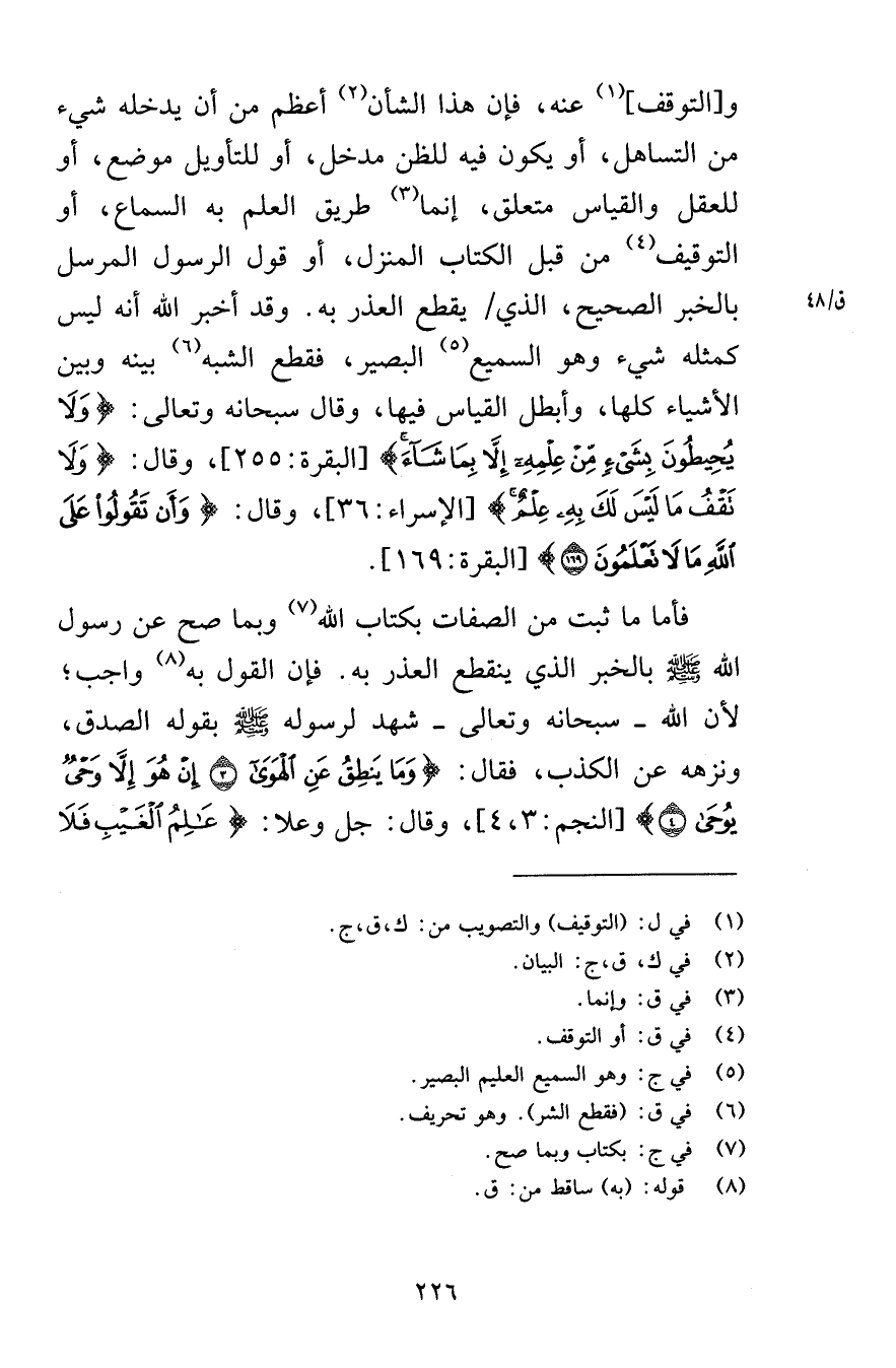 والتوقف عنه فإن هذا الشأن أعظم من أن يدخله شيء من التساهل أو يكون فيه للظن مدخل أو للتأويل موضع أو للعقل والقياس متعلق إنما طريق العلم به السماع أو التوقيف من قبل الكتاب المنزل أو قول الرسول المرسل بالخبر الصحيح الذي يقطع العذر به وقد أخبر الله أنه ليس كمثله شيء وهو السميع البصير فقطع الشبه بينه وبين الأشياء كلها وأبطل القياس فيها وقال سبحانه وتعالى وَلَا يُحِيطُونَ بِشَيْءٍ مِنْ عِلْمِهِ إِلَّا بِمَا شَاءَ [البقرة 255] وقال وَلَا تَقْفُ مَا لَيْسَ لَكَ بِهِ عِلْمٌ [الإسراء 36] وقال وَأَنْ تَقُولُوا عَلَى اللَّهِ مَا لَا تَعْلَمُونَ (169) [البقرة 169] فأما ما ثبت من الصفات بكتاب الله وبما صح عن رسول الله صلى الله عليه وسلم بالخبر الذي ينقطع العذر به فإن القول به واجب لأن الله سبحانه وتعالى شهد لرسوله صلى الله عليه وسلم بقوله الصدق ونزهه عن الكذب فقال وَمَا يَنْطِقُ عَنِ الْهَوَى (3) إِنْ هُوَ إِلَّا وَحْيٌ يُوحَى (4) [النجم 3-4] وقال جل وعلا عَالِمُ الْغَيْبِ فَلَا