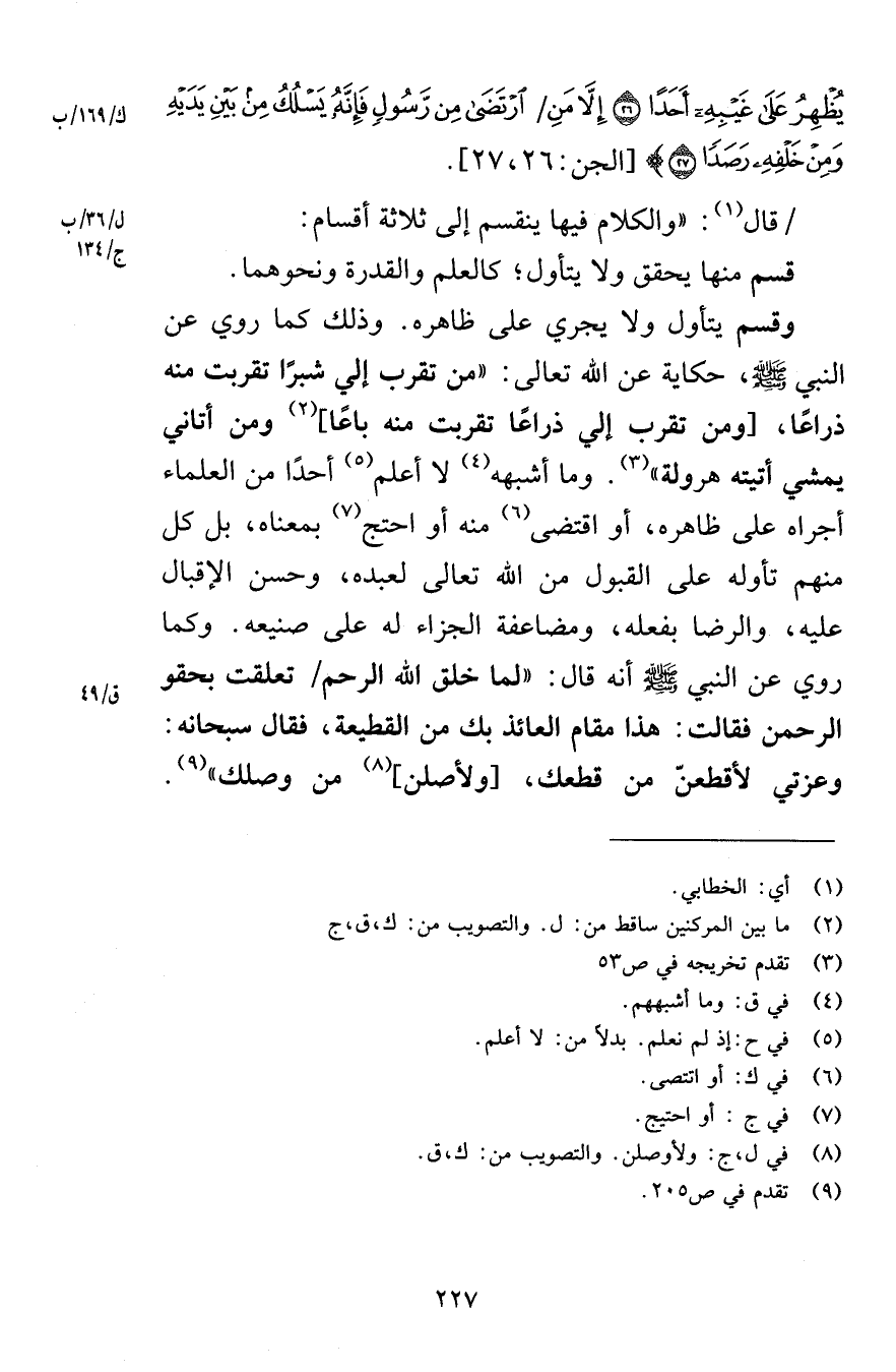 يُظْهِرُ عَلَى غَيْبِهِ أَحَدًا (26) إِلَّا مَنِ ارْتَضَى مِنْ رَسُولٍ فَإِنَّهُ يَسْلُكُ مِنْ بَيْنِ يَدَيْهِ وَمِنْ خَلْفِهِ رَصَدًا (27) [الجن 26-27] قال والكلام فيها ينقسم إلى ثلاثة أقسام قسم منها يحقق ولا يتأول كالعلم والقدرة ونحوهما وقسم يتأول ولا يجري على ظاهره وذلك كما روي عن النبي صلى الله عليه وسلم حكاية عن الله تعالى من تقرب إلي شبرًا تقربت منه ذراعًا ومن تقرب إلي ذراعًا تقربت منه باعًا ومن أتاني يمشي أتيته هرولة وما أشبهه لا أعلم أحدًا من العلماء أجراه على ظاهره أو اقتضى منه أو احتج بمعناه بل كل منهم تأوله على القبول من الله تعالى لعبده وحسن الإقبال عليه والرضا بفعله ومضاعفة الجزاء له على صنيعه وكما روي عن النبي صلى الله عليه وسلم أنه قال لما خلق الله الرحم تعلقت بحقو الرحمن فقالت هذا مقام العائذ بك من القطيعة فقال سبحانه وعزتي لأقطعنّ من قطعك ولأصلن من وصلك