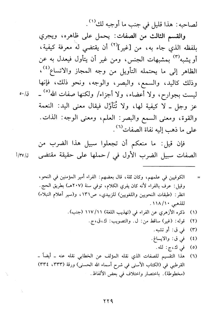لصاحبه هذا قليل في جنب ما أوجبه لك والقسم الثالث من الصفات يحمل على ظاهره ويجري بلفظه الذي جاء به من غير أن يقتضي له معرفة كيفية أو يشبه بمشبهات الجنس ومن غير أن يتأول فيعدل به عن الظاهر إلى ما يحتمله التأويل من وجه المجاز والاتساع وذلك كاليد والسمع والبصر والوجه ونحو ذلك فإنها ليست بجوارح ولا أعضاء ولا أجزاء ولكنها صفات الله عز وجل لا كيفية لها ولا تُتَأوَّل فيقال معنى اليد النعمة والقوة ومعنى السمع والبصر والعلم ومعنى الوجه الذات على ما ذهب إليه نفاة الصفات فإن قيل ما منعكم أن تجعلوا سبيل هذا الضرب من الصفات سبيل الضرب الأول في حملها على حقيقة مقتضى