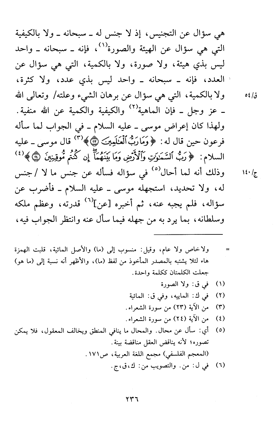 هي سؤال عن التجنيس إذ لا جنس له سبحانه ولا بالكيفية التي هي سؤال عن الهيئة والصورة فإنه سبحانه واحد ليس بذي هيئة ولا صورة ولا بالكمية التي هي سؤال عن العدد فإنه سبحانه واحد ليس بذي عدد ولا كثرة ولا بالكمية التي هي سؤال عن برهان الشيء وعلته وتعالى الله عز وجل فإن الماهية والكيفية والكمية عن الله منفية ولهذا كان إعراض موسى عليه السلام في الجواب لما سأله فرعون حين قال له وَمَا رَبُّ الْعَالَمِينَ (23) قال موسى عليه السلام رَبُّ السَّمَاوَاتِ وَالْأَرْضِ وَمَا بَيْنَهُمَا إِنْ كُنْتُمْ مُوقِنِينَ (24) وذلك أنه لما أحال في سؤاله فسأله عن جنس ما لا جنس له ولا تحديد استجهله موسى عليه السلام فأضرب عن سؤاله فلم يجب عنه ثم أخبره عن قدرته وعظم ملكه وسلطانه بما يرد به من جهله فيما سأل عنه وانتظر الجواب فيه