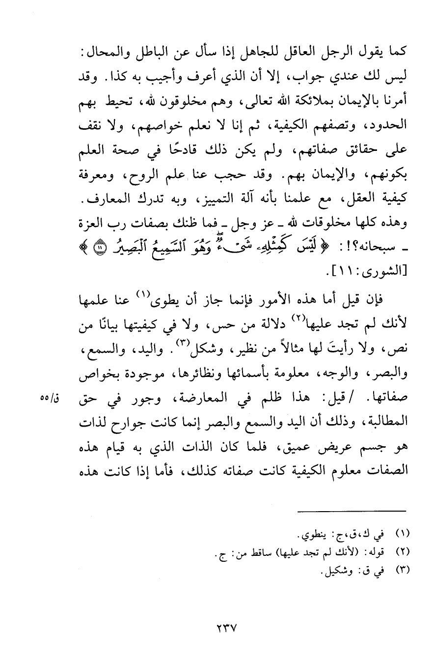 كما يقول الرجل العاقل للجاهل إذا سأل عن الباطل والمحال ليس لك عندي جواب إلا أن الذي أعرف وأجيب به كذا وقد أمرنا بالإيمان بملائكة الله تعالى وهم مخلوقون لله تحيط بهم الحدود وتصفهم الكيفية ثم إنا لا نعلم خواصهم ولا نقف على حقائق صفاتهم ولم يكن ذلك قادحًا في صحة العلم بكونهم والإيمان بهم وقد حجب عنا علم الروح ومعرفة كيفية العقل مع علمنا بأنه آلة التمييز وبه تدرك المعارف وهذه كلها مخلوقات لله عز وجل فما ظنك بصفات رب العزة سبحانه لَيْسَ كَمِثْلِهِ شَيْءٌ وَهُوَ السَّمِيعُ الْبَصِيرُ (11) [الشورى 11] فإن قيل أما هذه الأمور فإنما جاز أن يطوى عنا علمها لأنك لم تجد عليها دلالة من حس ولا في كيفيتها بيانًا من نص ولا رأيتَ لها مثالاً من نظير وشكل واليد والسمع والبصر والوجه معلومة بأسمائها ونظائرها موجودة بخواص صفاتها قيل هذا ظلم في المعارضة وجور في حق المطالبة وذلك أن اليد والسمع والبصر إنما كانت جوارح لذات هو جسم عريض عميق فلما كان الذات الذي به قيام هذه الصفات معلوم الكيفية كانت صفاته كذلك فأما إذا كانت هذه