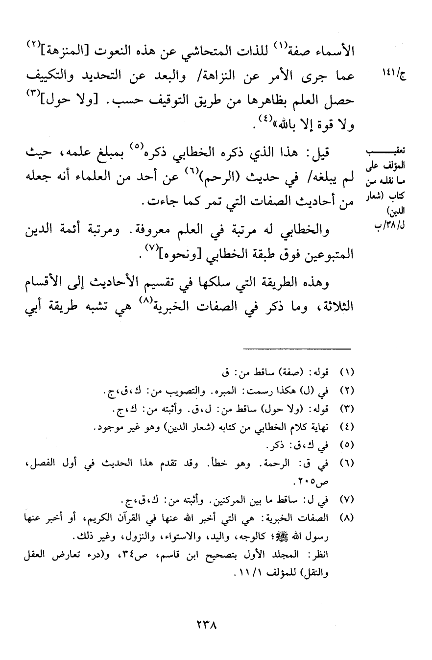 الأسماء صفة للذات المتحاشي عن هذه النعوت المنزهة عما جرى الأمر عن النزاهة والبعد عن التحديد والتكييف حصل العلم بظاهرها من طريق التوقيف حسب ولا حول ولا قوة إلا بالله قيل هذا الذي ذكره الخطابي ذكره بمبلغ علمه حيث لم يبلغه في حديث الرحم عن أحد من العلماء أنه جعله من أحاديث الصفات التي تمر كما جاءت والخطابي له مرتبة في العلم معروفة ومرتبة أئمة الدين المتبوعين فوق طبقة الخطابي ونحوه وهذه الطريقة التي سلكها في تقسيم الأحاديث إلى الأقسام الثلاثة وما ذكر في الصفات الخبرية هي تشبه طريقة أبي
